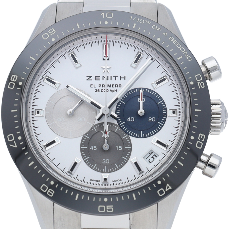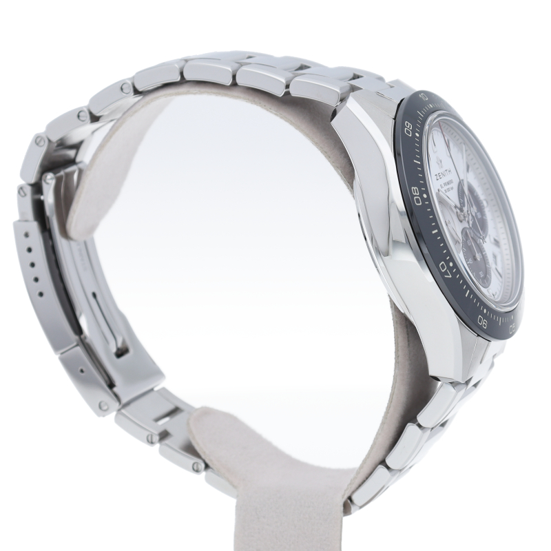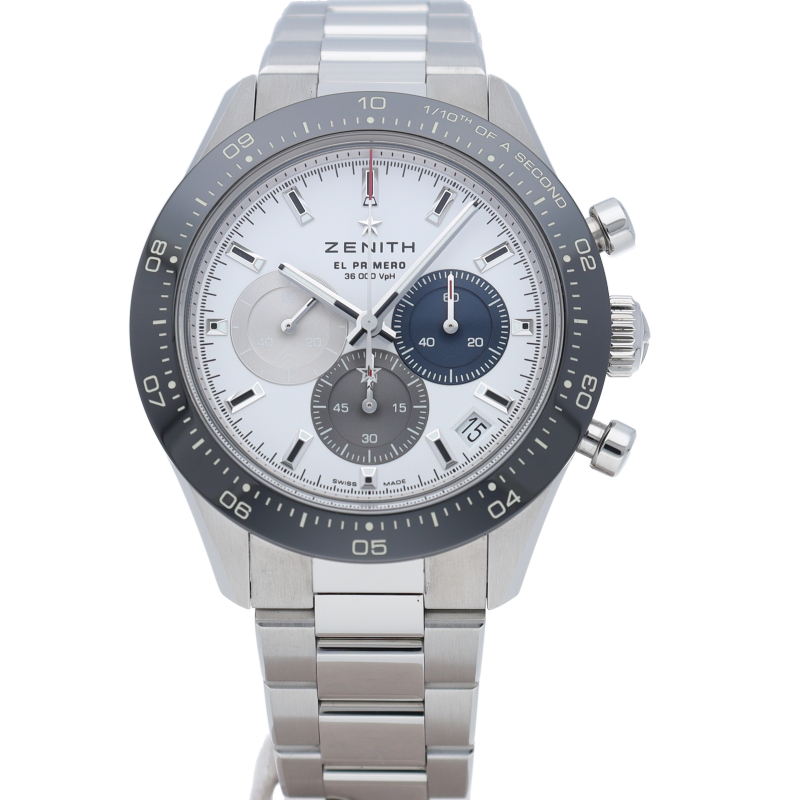 クロノマスター スポーツは、ゼニスが50年以上に渡って探求してきたスポーティーなクロノグラフと自動巻クロノグラフ キャリバーの頂点に立つモデルです。1/10秒単位の精度で経過時間を計測および表示する最新のエル・プリメロ クロノグラフ キャリバーを搭載したこのモデルは、現代的でありながら見間違えることのないゼニスらしいデザインを備えています。