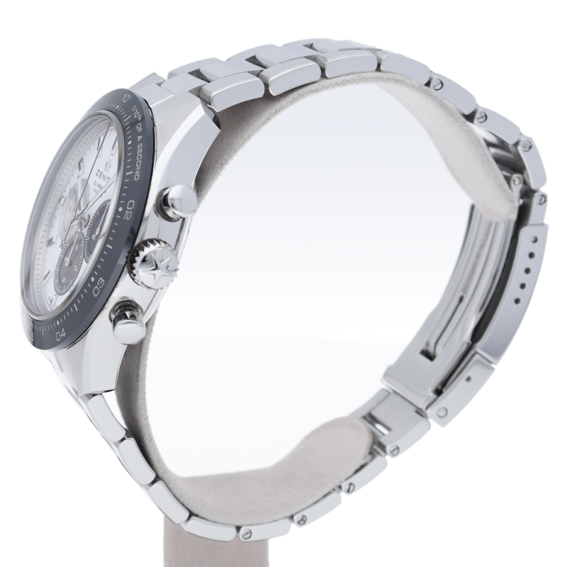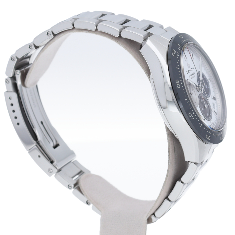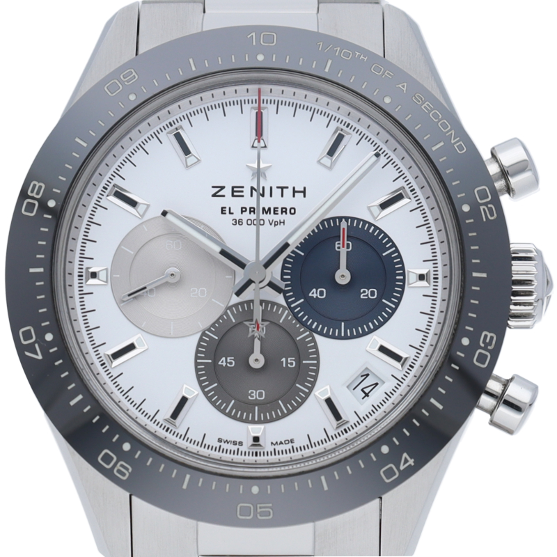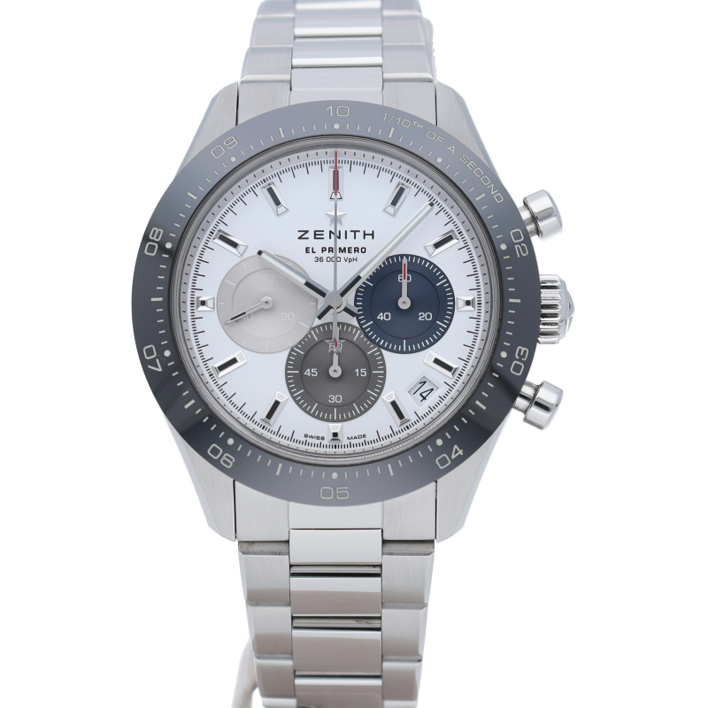 クロノマスター スポーツは、ゼニスが50年以上に渡って探求してきたスポーティーなクロノグラフと自動巻クロノグラフ キャリバーの頂点に立つモデルです。1/10秒単位の精度で経過時間を計測および表示する最新のエル・プリメロ クロノグラフ キャリバーを搭載したこのモデルは、現代的でありながら見間違えることのないゼニスらしいデザインを備えています。