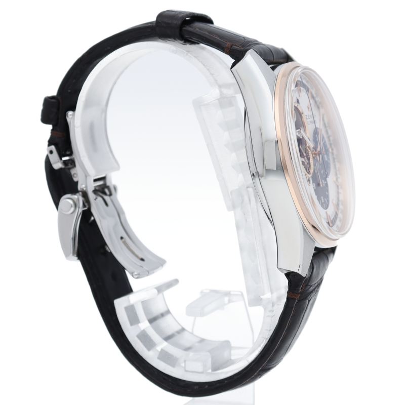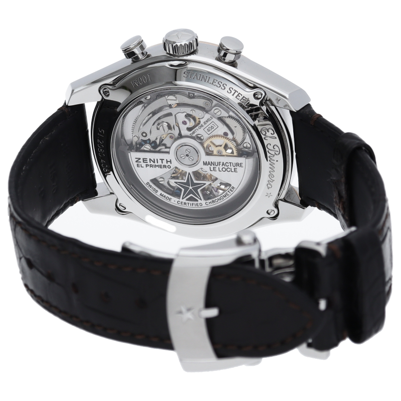 毎時36000回という驚異的な振動数を誇る名作ムーブメント「エル・プリメロ4061」搭載のクロノマスター。文字盤とシースルーバックより眺められるシースルー構造の「オープン」仕様モデル。