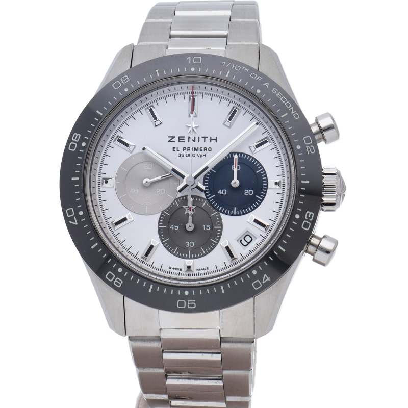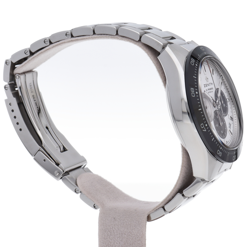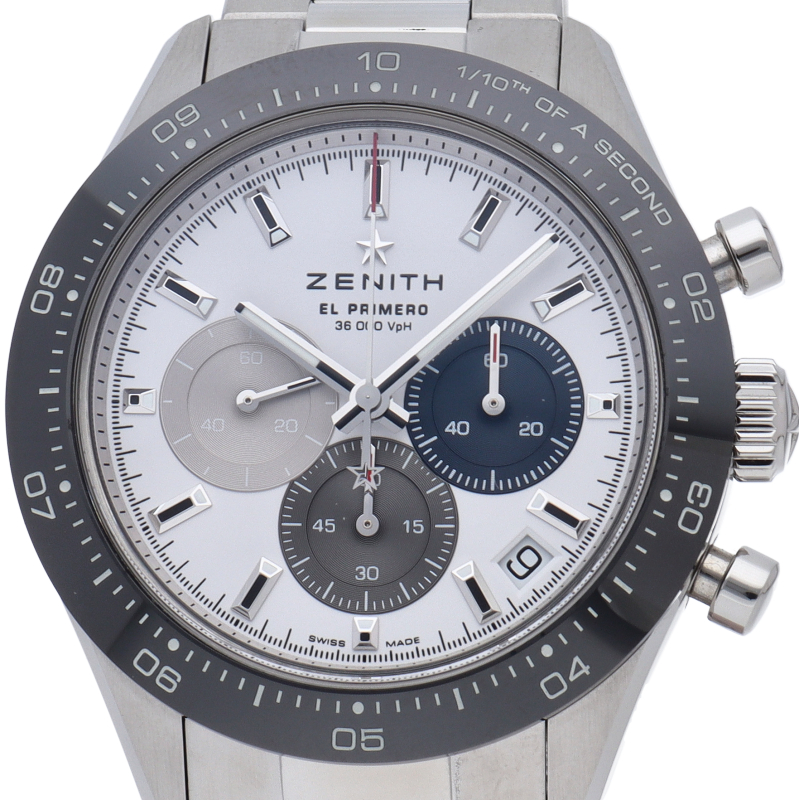 クロノマスター スポーツは、ゼニスが50年以上に渡って探求してきたスポーティーなクロノグラフと自動巻クロノグラフ キャリバーの頂点に立つモデルです。1/10秒単位の精度で経過時間を計測および表示する最新のエル・プリメロ クロノグラフ キャリバーを搭載したこのモデルは、現代的でありながら見間違えることのないゼニスらしいデザインを備えています。