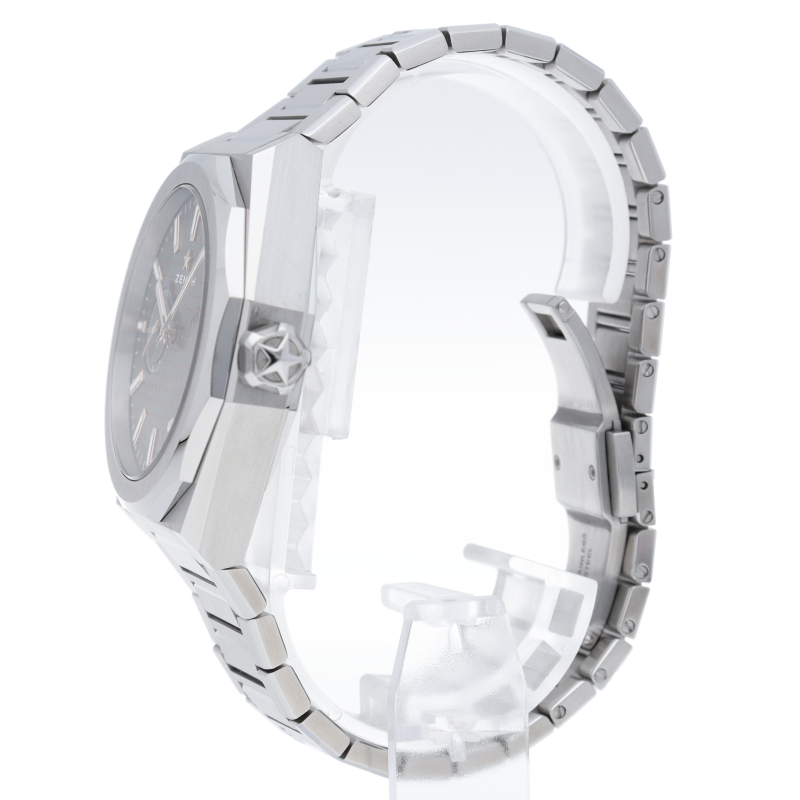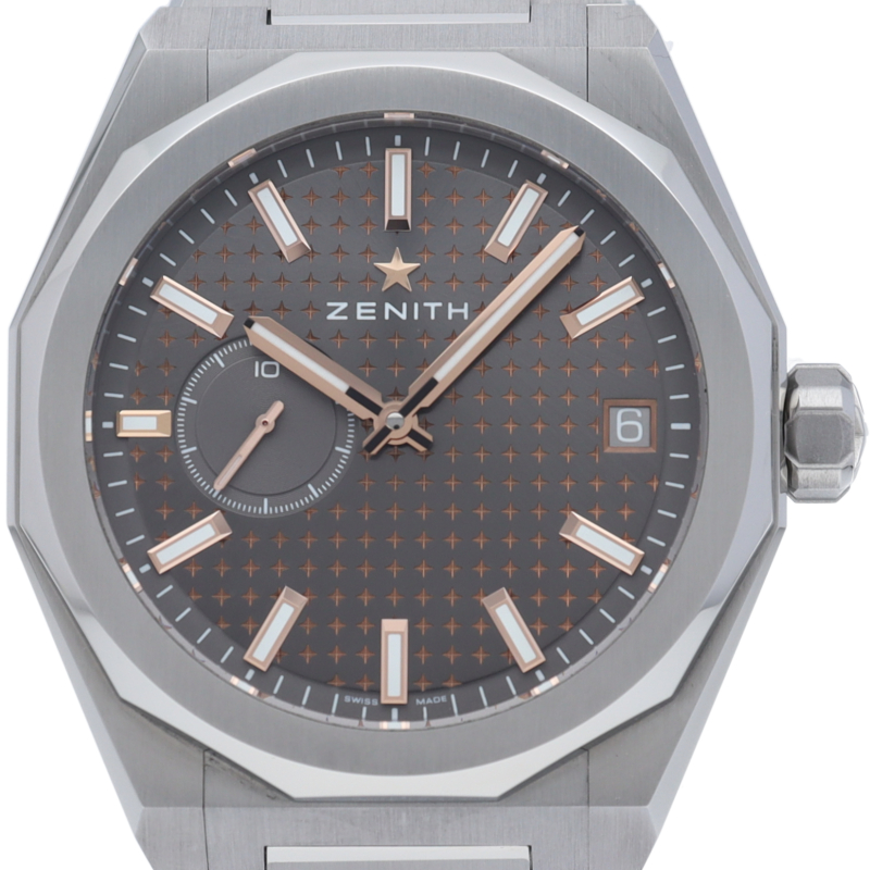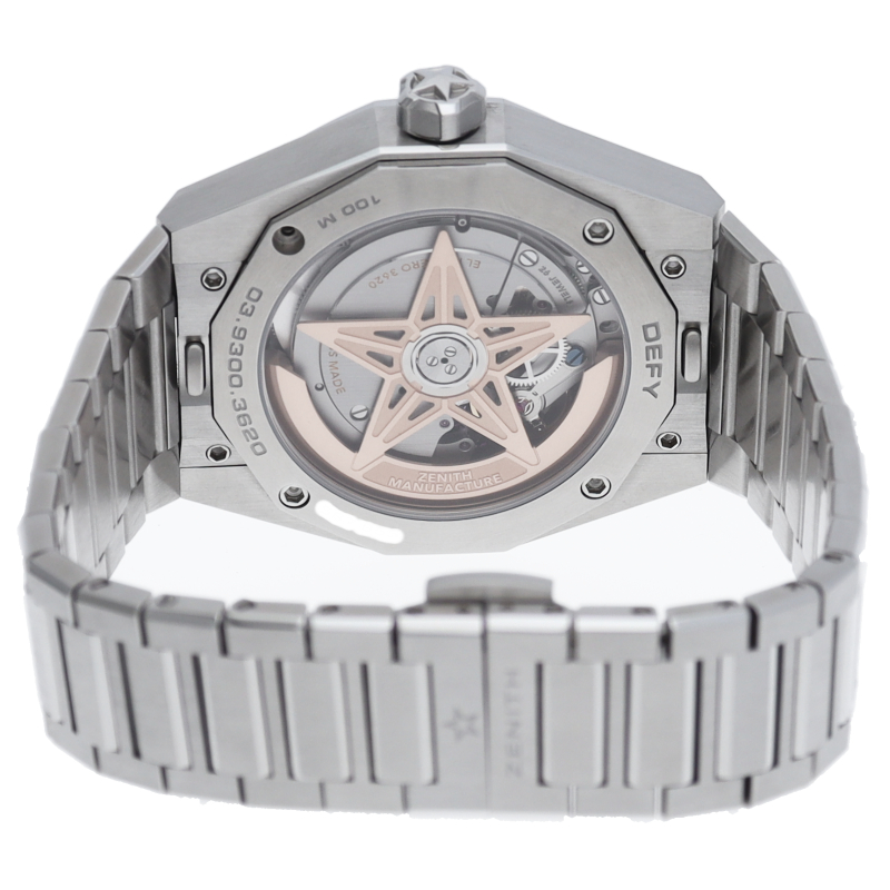 デファイ スカイラインでは、ファセットカットのベゼルを配した41mmスチール製の八角形のケースを使用し、グレーのサンバースト仕上げとローズゴールドのアクセントを施した文字盤にはゼニスの象徴である4つの点を結んだ星を復刻させてあしらっています。1/10秒精度を誇る初のインジケーターを備えた高振動エル・プリメロ 3620自動巻クロノグラフムーブメントを搭載。