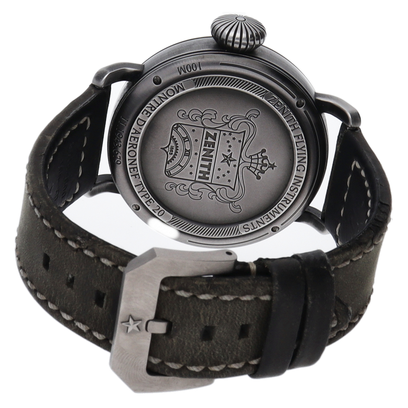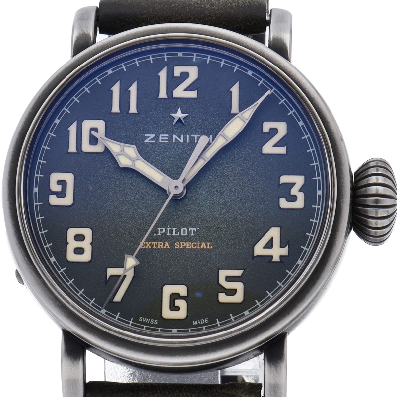 ゼニスの伝説的なパイロットウォッチからインスピレーションした「パイロット タイプ20」。こちらは仏航空界を牽引したパイロット”ルイ・ブレリオ”が使用していた 初期型のパイロットウォッチを現代に蘇らせたモデルです。ブラックマットダイヤルにグリーンオイリーヌバックレザーストラップとも相まって、ヴィンテージ感溢れる一本です。