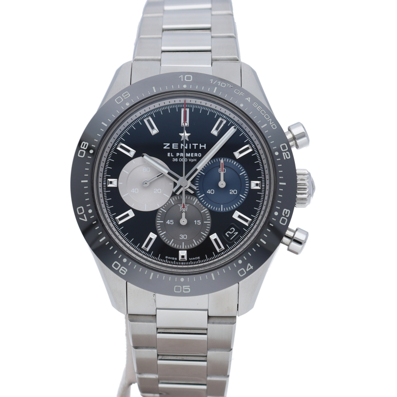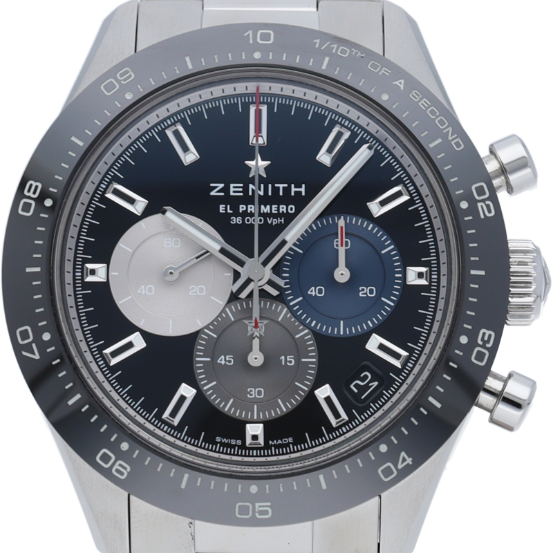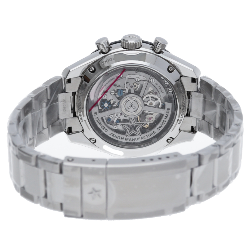 クロノマスター スポーツは、3色文字盤、ポンプ型のプッシュボタン、スチール製ブレスレットとセラミック製のブラックベゼルなど、過去のゼニス クロノグラフの要素を現代的な41mmケースに組み込んでいます。このバージョンには、ブラックの文字盤と一体型のスチール製ブレスレットが付属しています。