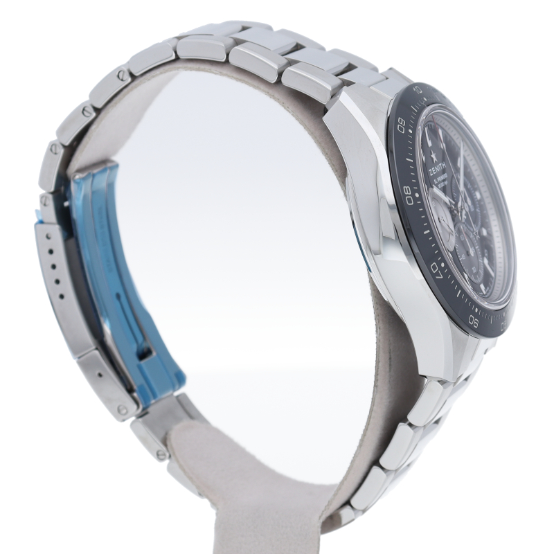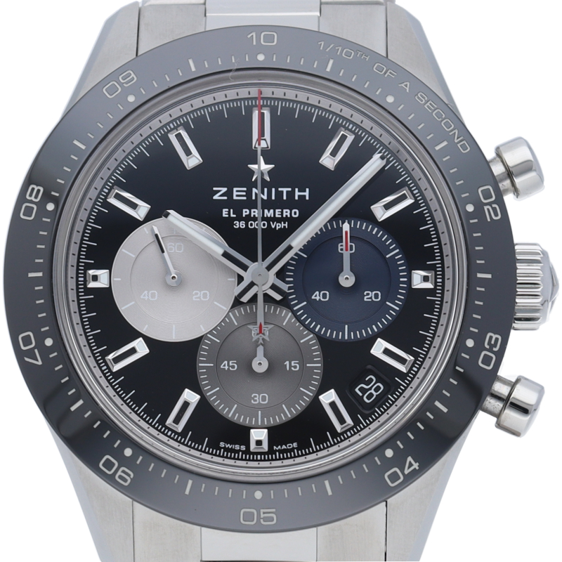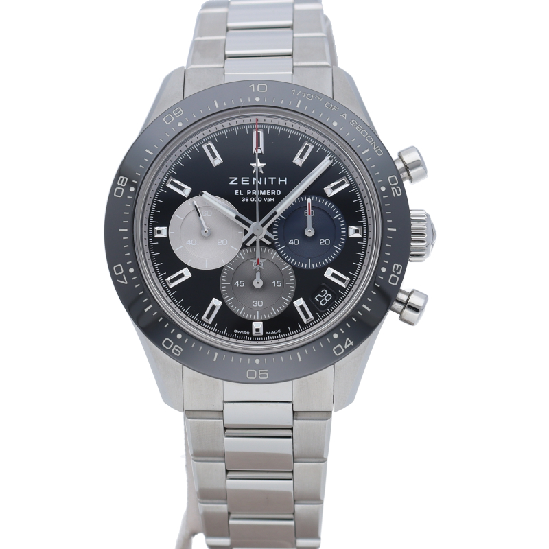 クロノマスター スポーツは、3色文字盤、ポンプ型のプッシュボタン、スチール製ブレスレットとセラミック製のブラックベゼルなど、過去のゼニス クロノグラフの要素を現代的な41mmケースに組み込んでいます。このバージョンには、ブラックの文字盤と一体型のスチール製ブレスレットが付属しています。