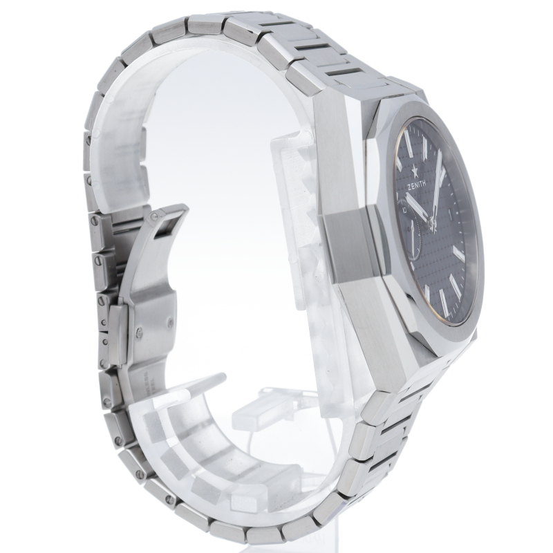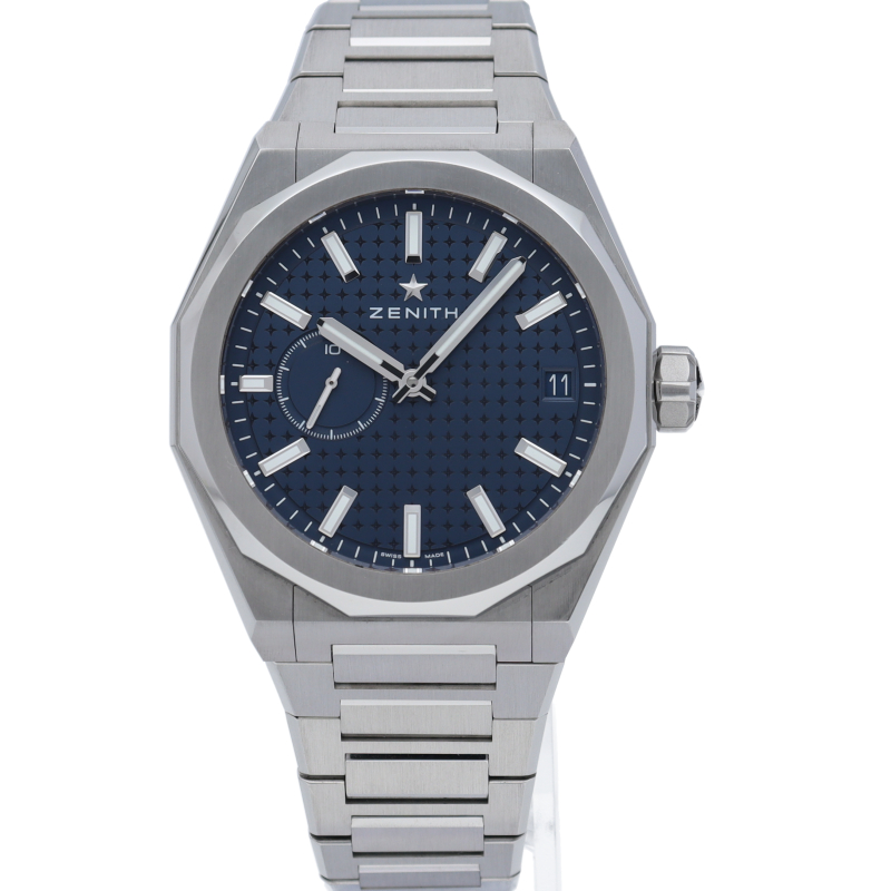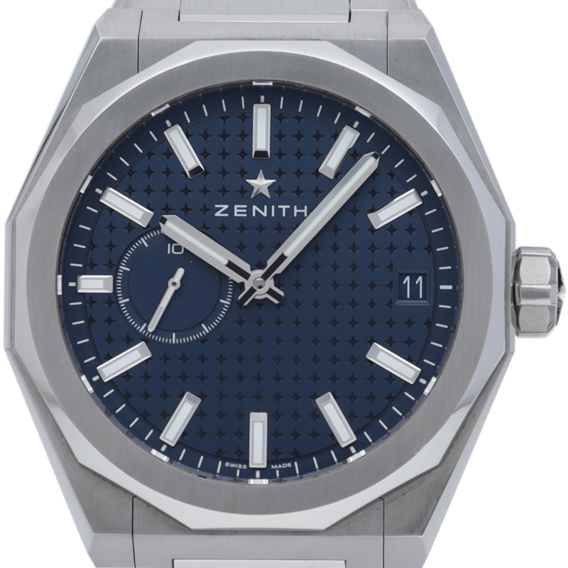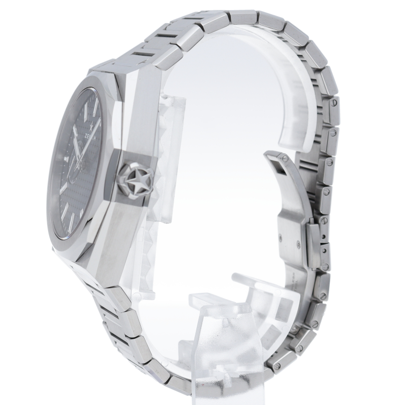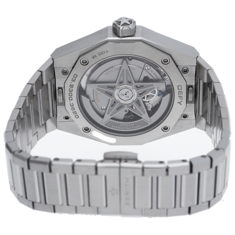 「デファイ スカイライン」では、ファセットカットのベゼルを配した41mmスチール製の八角形のケースを使用し、ブルートーンのサンバースト仕上げを施した文字盤にはゼニスの象徴である4つの点を結んだ星を復刻させてあしらっています。1/10秒精度を誇る初のインジケーターを備えた高振動エル・プリメロ 3620自動巻クロノグラフムーブメントを搭載。交換可能なスチール製ブレスレットとブルーパターンのラバーストラップ。
