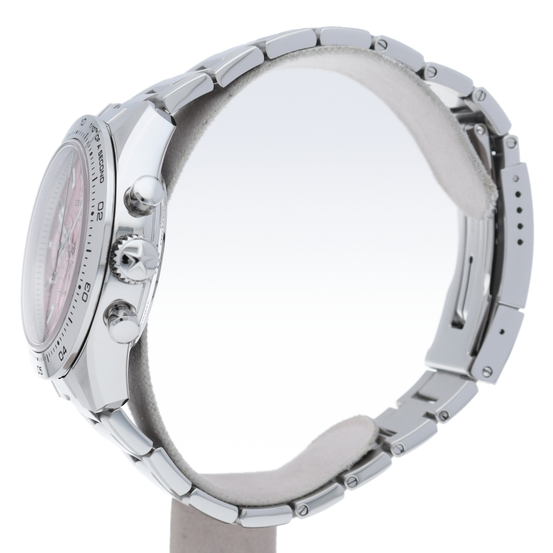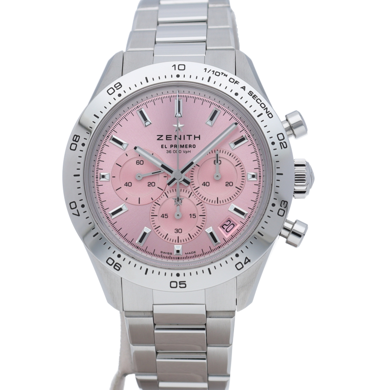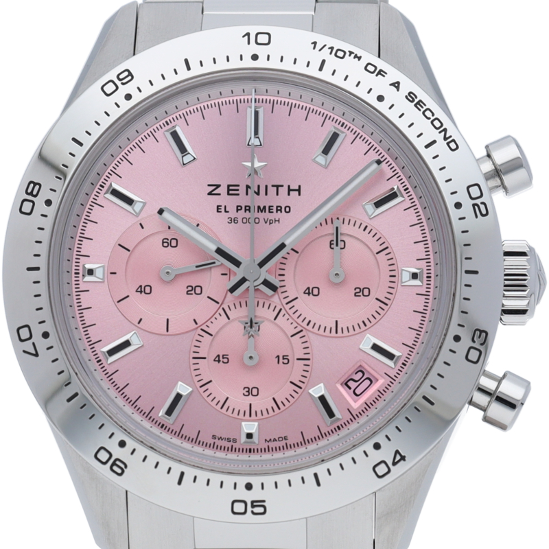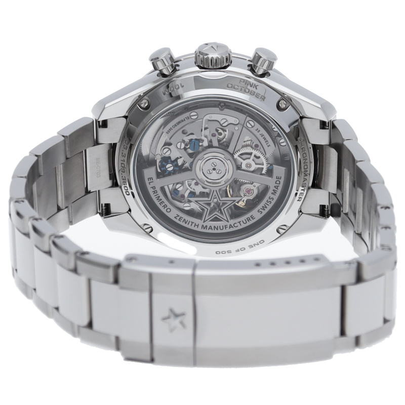 41mmのスチール製ケース、ポリッシュ仕上げスチール製ベゼル、メタリックピンクの文字盤、スチール製ブレスレットを組み合わせた「クロノマスター スポーツ ピンク」。高振動エル プリメロ 3600自動巻クロノグラフムーブメントを搭載し、1/10秒精度のクロノグラフ機能と60時間のパワーリザーブを備えています。500本限定モデルで、その売上の一部はスーザンG.コーメン乳がん財団に寄付されます。