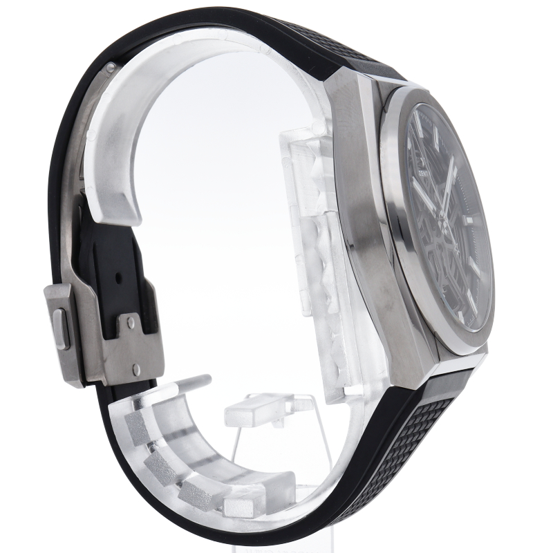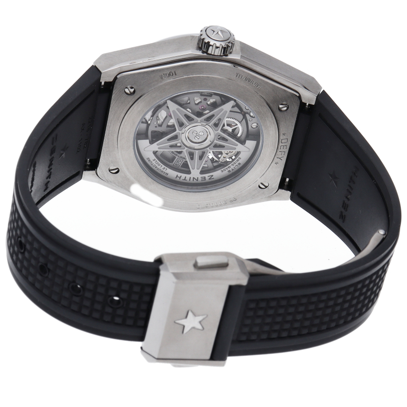 本質的な機能をまとめたスタイルは、デファイの美学を凝縮させています。大きなバトン型の時針と分針、有名な星のカウンターウェイトを備えた秒針が、ゼニスのシンボルである星を感じさせる5本のブランチの上を滑らかに回ります。ディープブルーのミニッツリングにはアプライドアワーマーカーが並び、スポーティなオープンワークのメカニズムを引き立てます。