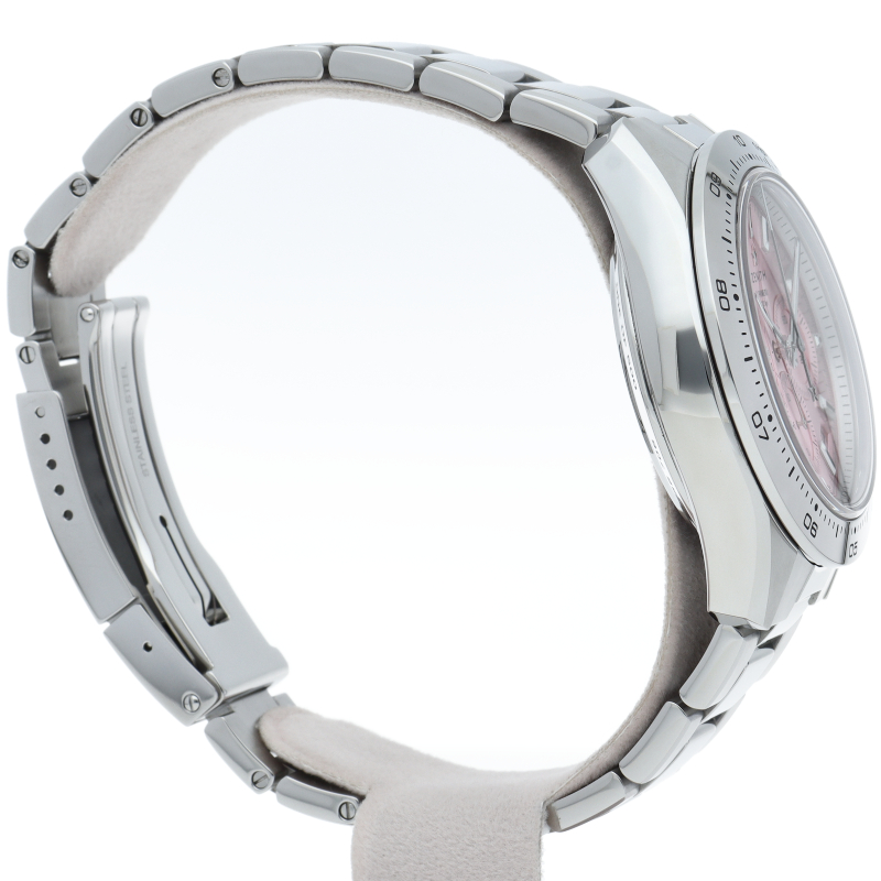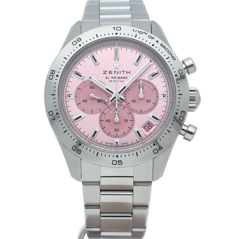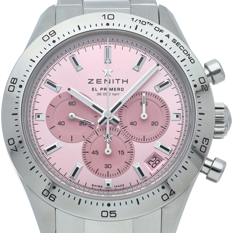 41mmのスチール製ケース、ポリッシュ仕上げスチール製ベゼル、メタリックピンクの文字盤、スチール製ブレスレットを組み合わせた「クロノマスター スポーツ ピンク」。高振動エル プリメロ 3600自動巻クロノグラフムーブメントを搭載し、1/10秒精度のクロノグラフ機能と60時間のパワーリザーブを備えています。500本限定モデルで、その売上の一部はスーザンG.コーメン乳がん財団に寄付されます。