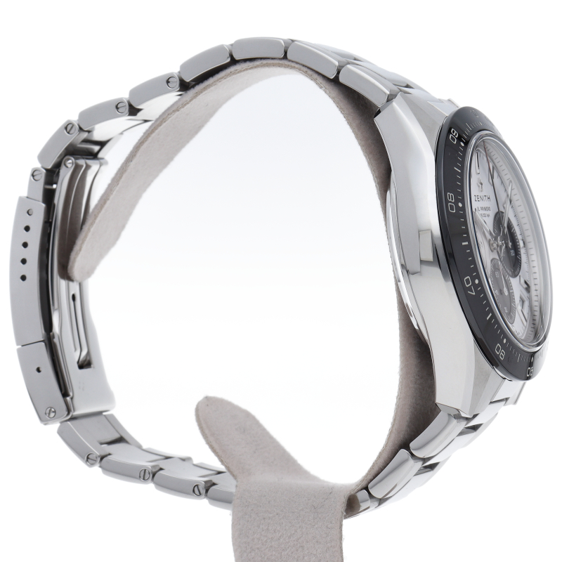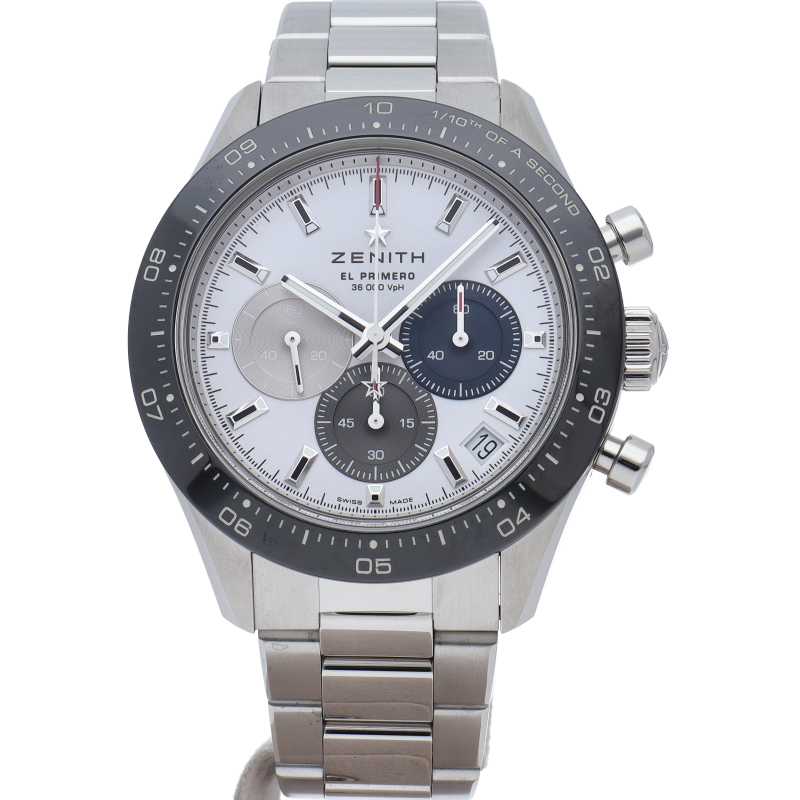 クロノマスター スポーツは、ゼニスが50年以上に渡って探求してきたスポーティーなクロノグラフと自動巻クロノグラフ キャリバーの頂点に立つモデルです。1/10秒単位の精度で経過時間を計測および表示する最新のエル・プリメロ クロノグラフ キャリバーを搭載したこのモデルは、現代的でありながら見間違えることのないゼニスらしいデザインを備えています。