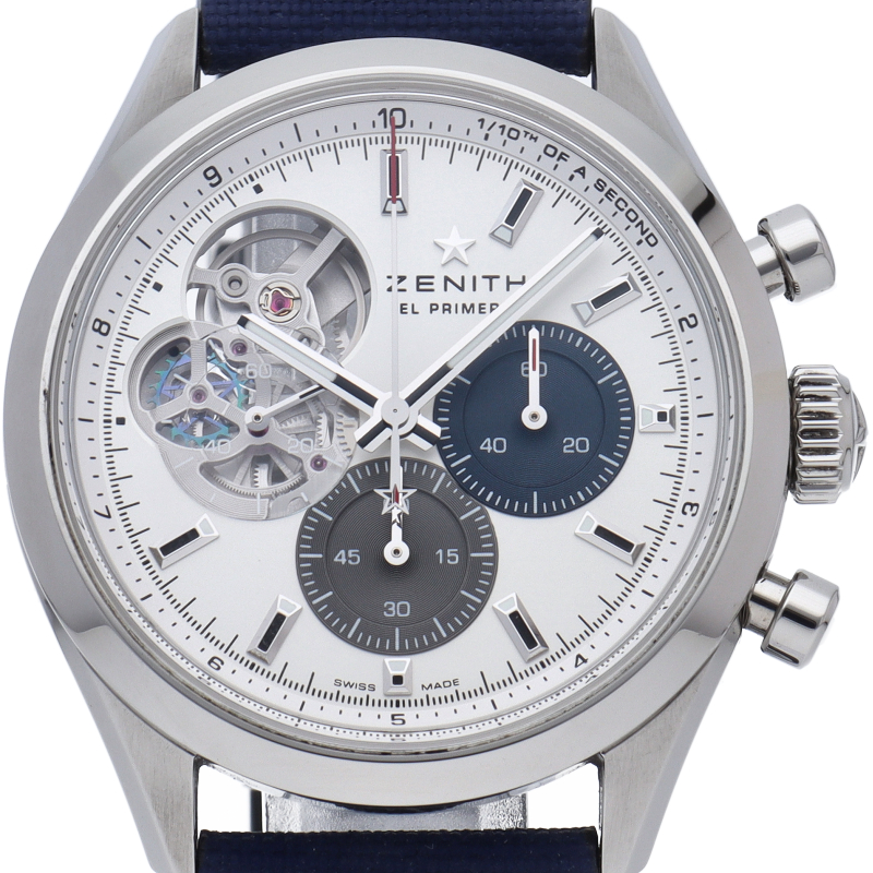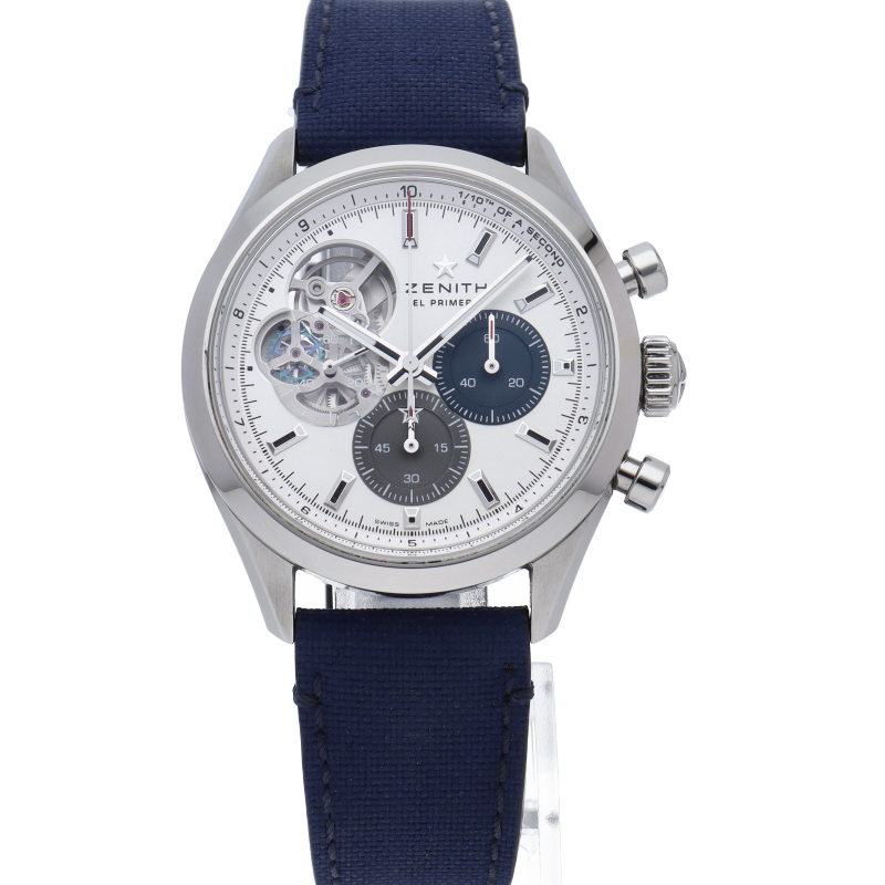ゼニスが誇るエル・プリメロ クロノグラフの神髄を現代的に昇華させた「クロノマスター オープン」。1969年に発表されたアイコニックなA386の、ひと目でエル・プリメロと分かる3色文字盤のデザインを受け継ぎながら、スケルトンの透明感を表現しています。過去モデルでは、9時位置のスモールセコンドカウンター全体をカットアウトしていたのに対し、このモデルでは3色カウンターにヘサライトクリスタル製のエレメントを使用。