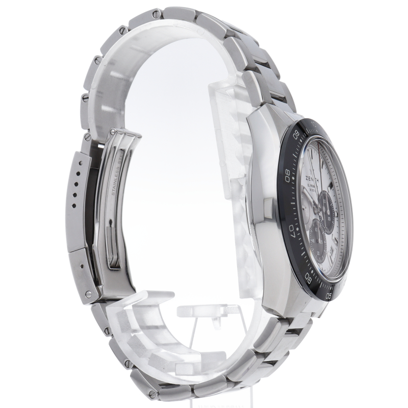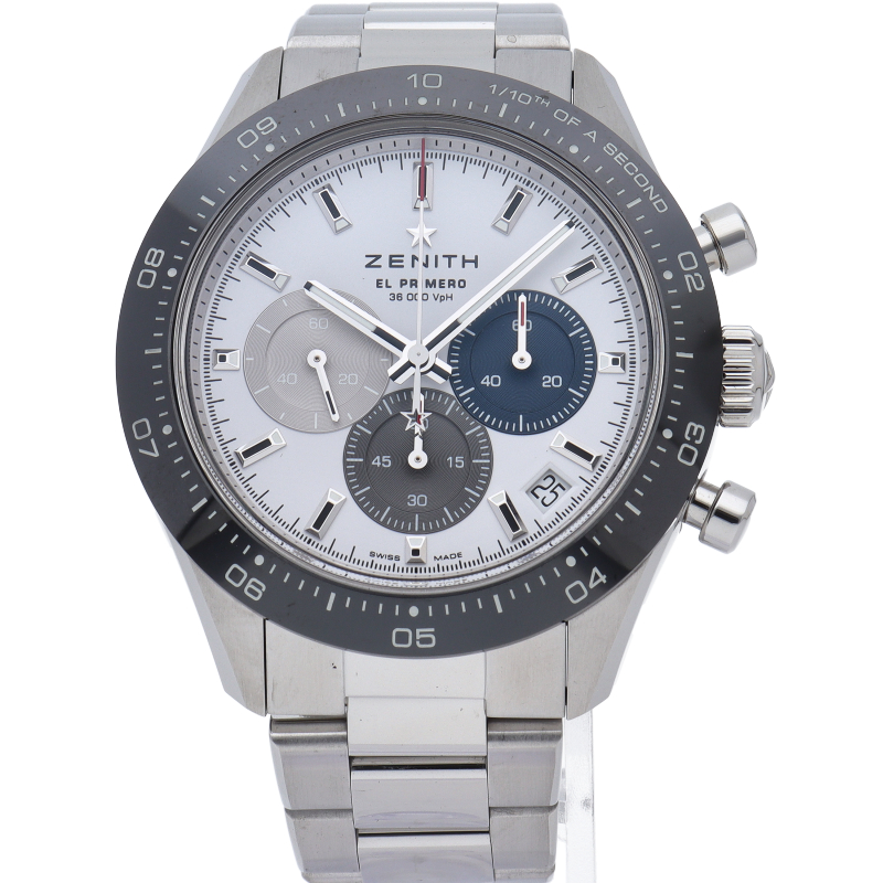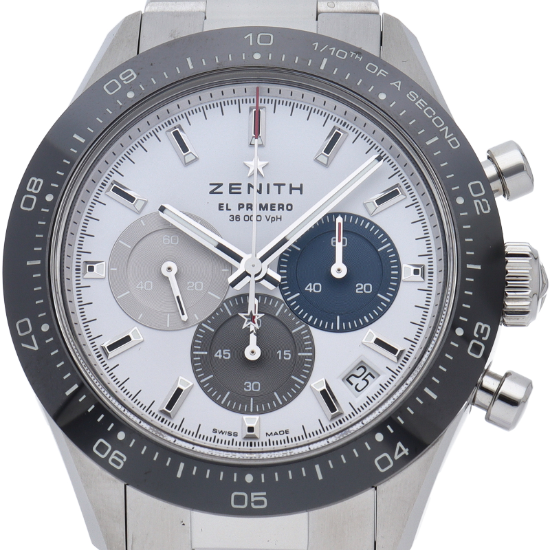 クロノマスター スポーツは、ゼニスが50年以上に渡って探求してきたスポーティーなクロノグラフと自動巻クロノグラフ キャリバーの頂点に立つモデルです。1/10秒単位の精度で経過時間を計測および表示する最新のエル・プリメロ クロノグラフ キャリバーを搭載したこのモデルは、現代的でありながら見間違えることのないゼニスらしいデザインを備えています。