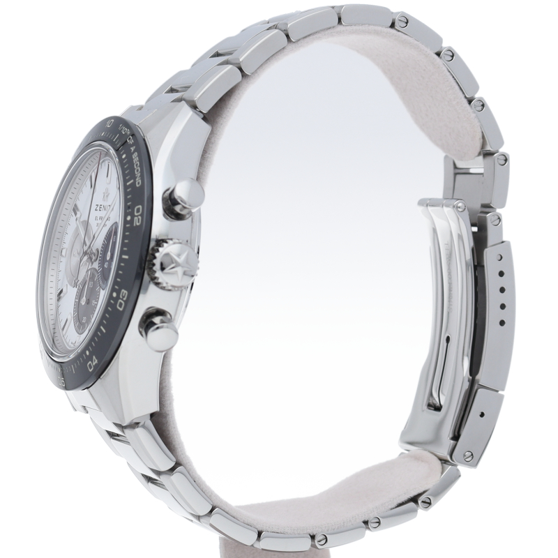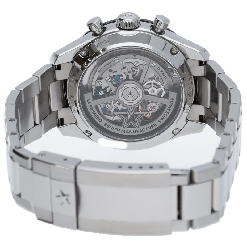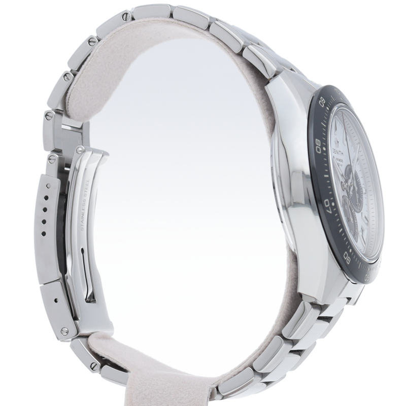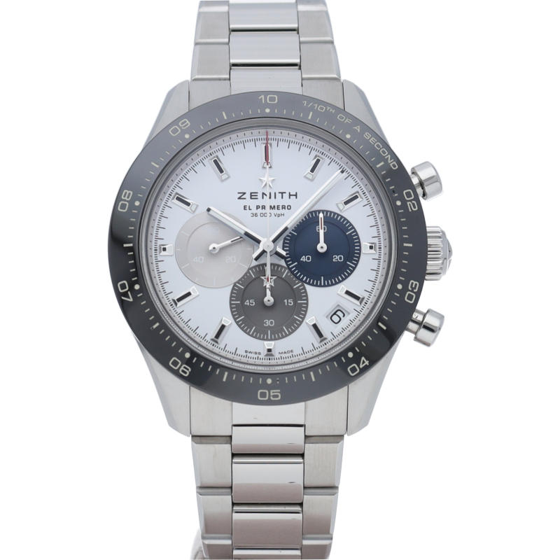 クロノマスター スポーツは、ゼニスが50年以上に渡って探求してきたスポーティーなクロノグラフと自動巻クロノグラフ キャリバーの頂点に立つモデルです。1/10秒単位の精度で経過時間を計測および表示する最新のエル・プリメロ クロノグラフ キャリバーを搭載したこのモデルは、現代的でありながら見間違えることのないゼニスらしいデザインを備えています。