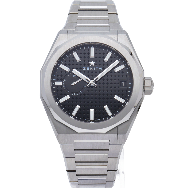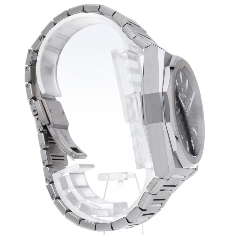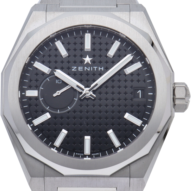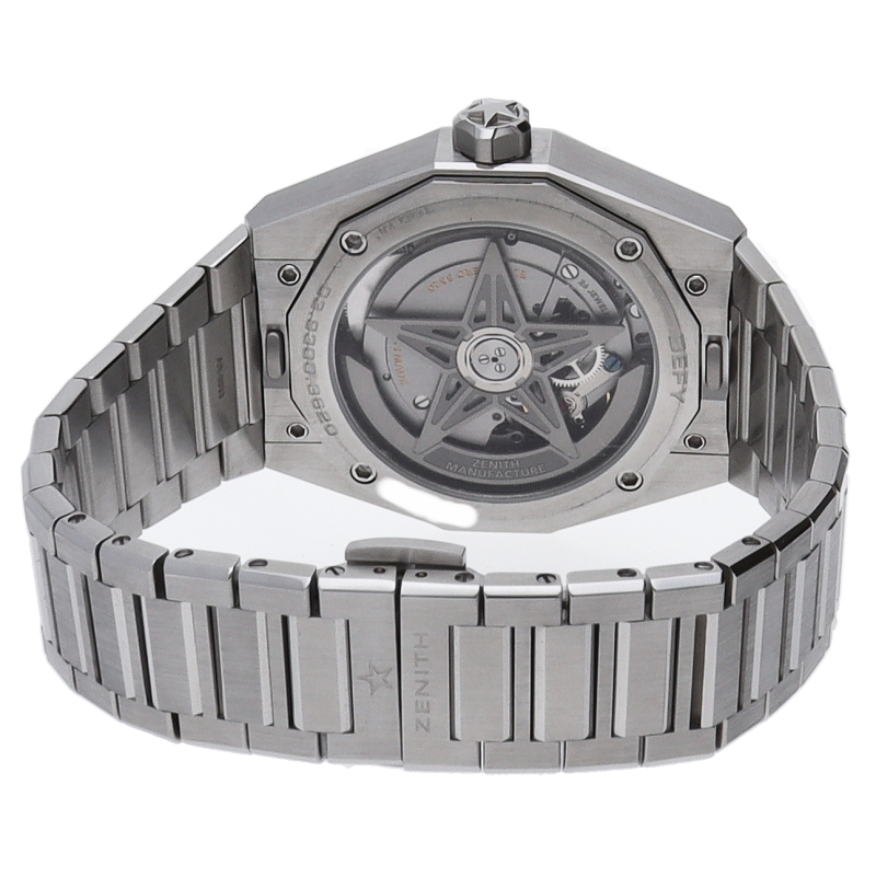 「デファイ スカイライン」は、単に過去のモデルを再現しようとしたのではなく、初期のデファイ モデルのユニークな八角形のフォルムからインスピレーションを得ています。ファセットカットのベゼルを配したステンレススチール製の八角形のケースを使用し、ブラックトーンのサンバースト仕上げを施した文字盤にはゼニスの象徴である4つの点を結んだ星を復刻させてあしらっています。