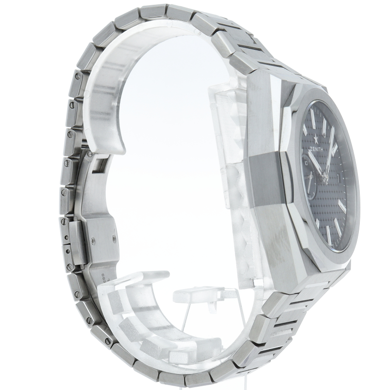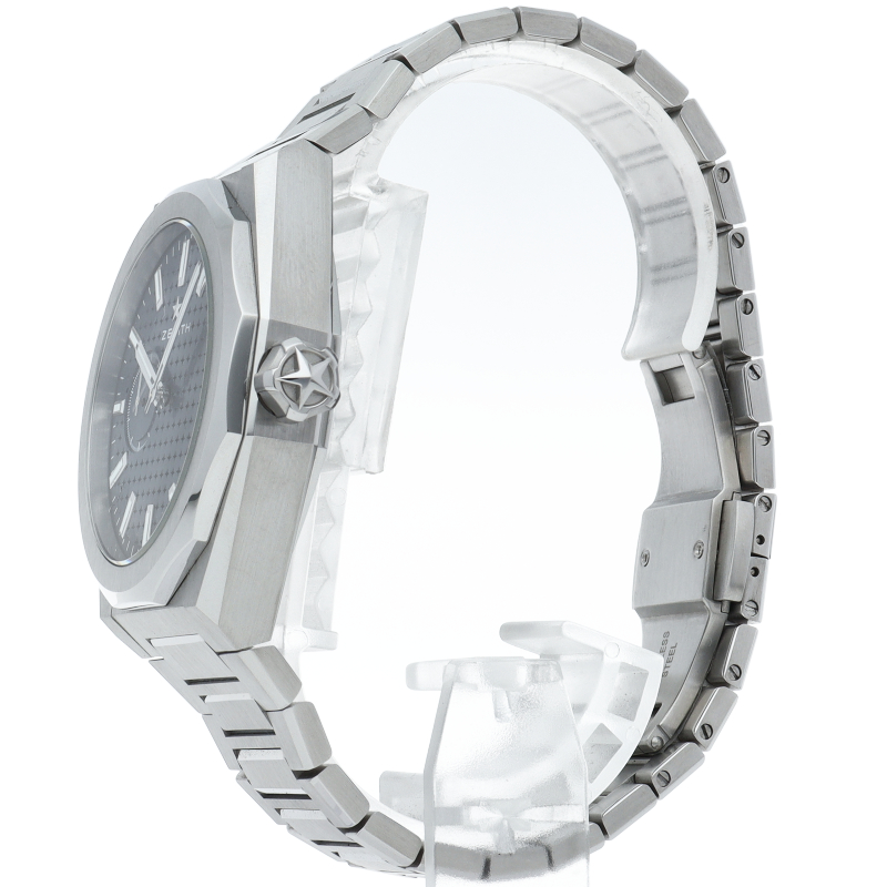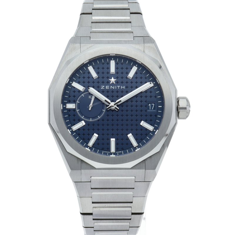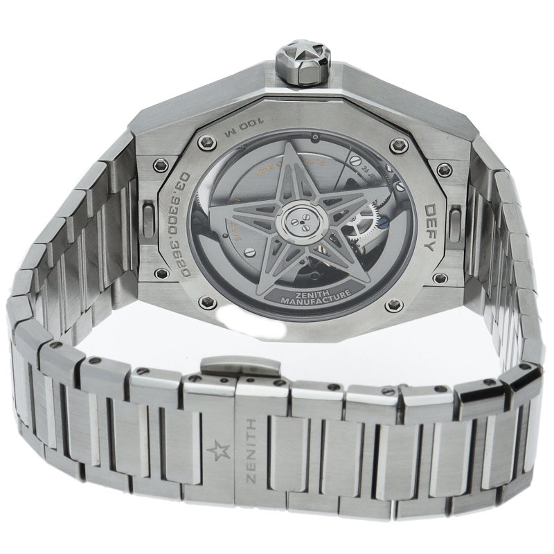 「デファイ スカイライン」では、ファセットカットのベゼルを配した41mmスチール製の八角形のケースを使用し、ブルートーンのサンバースト仕上げを施した文字盤にはゼニスの象徴である4つの点を結んだ星を復刻させてあしらっています。1/10秒精度を誇る初のインジケーターを備えた高振動エル・プリメロ 3620自動巻クロノグラフムーブメントを搭載。交換可能なスチール製ブレスレットとブルーパターンのラバーストラップ。