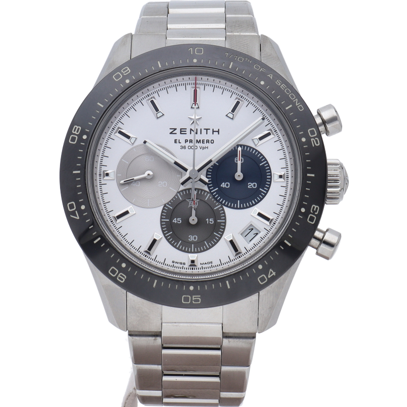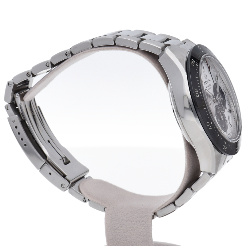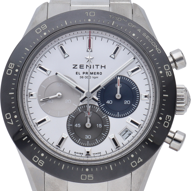 クロノマスター スポーツは、ゼニスが50年以上に渡って探求してきたスポーティーなクロノグラフと自動巻クロノグラフ キャリバーの頂点に立つモデルです。1/10秒単位の精度で経過時間を計測および表示する最新のエル・プリメロ クロノグラフ キャリバーを搭載したこのモデルは、現代的でありながら見間違えることのないゼニスらしいデザインを備えています。