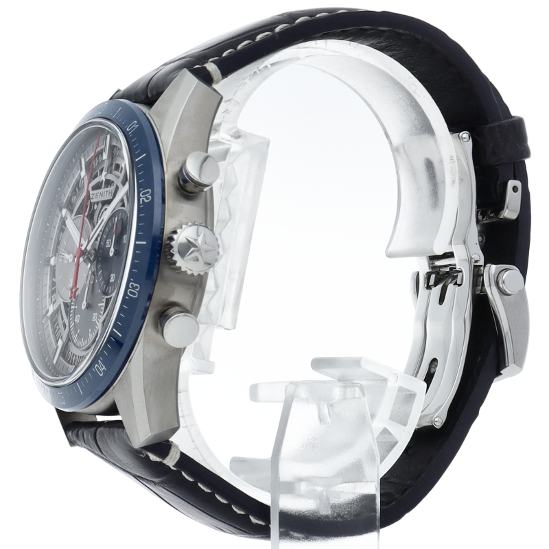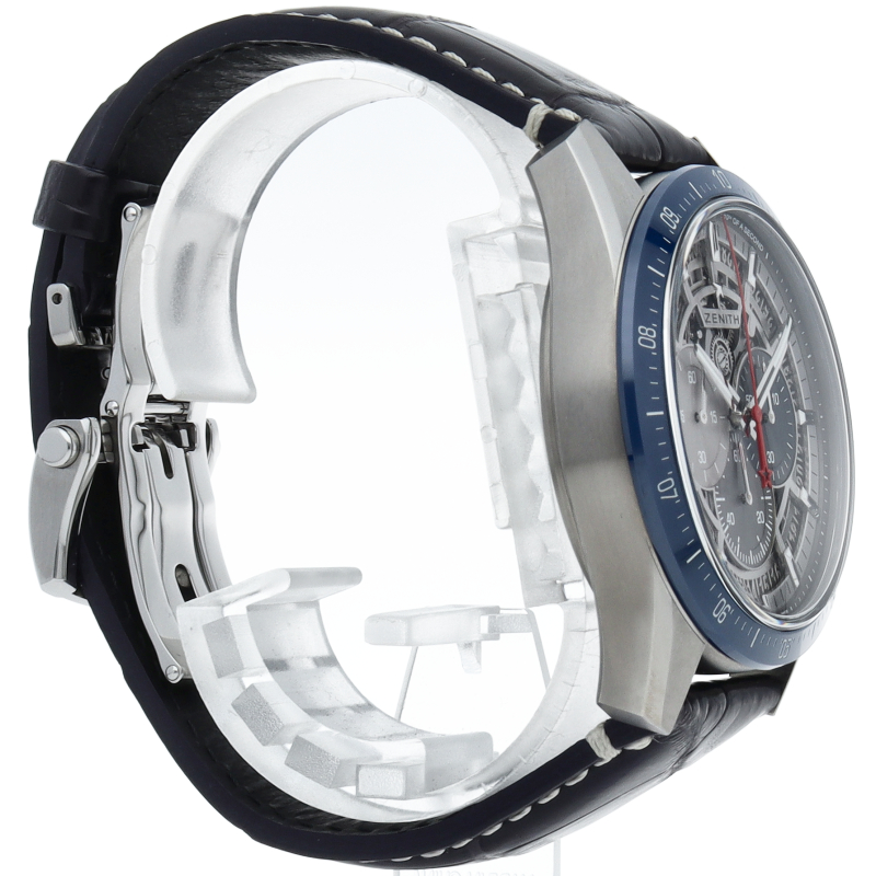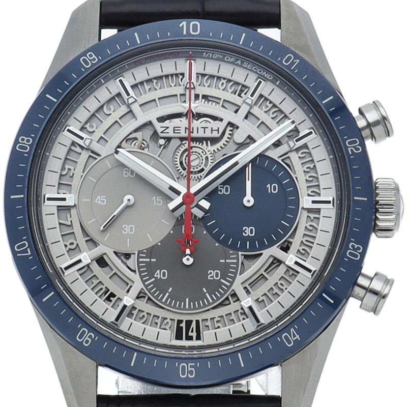 1969年に誕生したゼニス社の誇るエル・プリメロムーブメントの50周年を記念して2019年に世界250本で発売されたエル・プリメロ クロノマスター2。インダイアルにはオリジナルモデルと同じライトグレー、ブルー、チャコールグレーの3色カウンターを使用していますが、その他の部分はスケルトン仕様となっております。赤色のセンタークロノグラフ針は10秒で一回転し、ブルー・セラミックベゼル上で1/10秒の精度での計測が可能です。