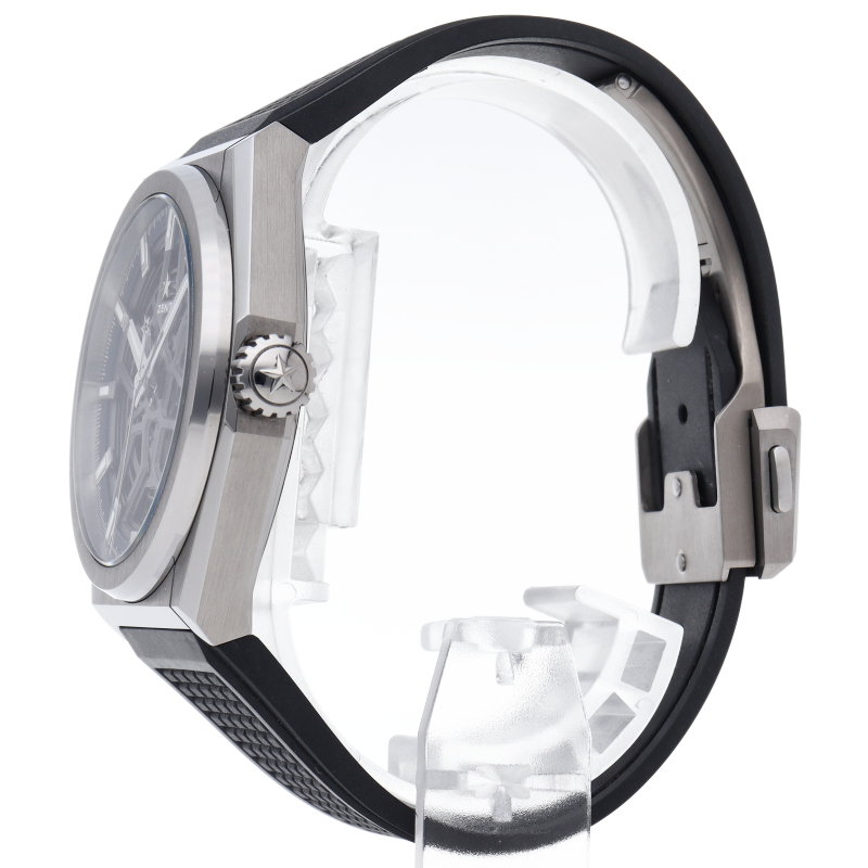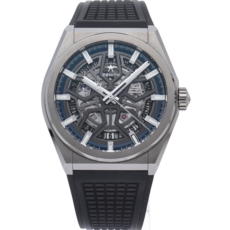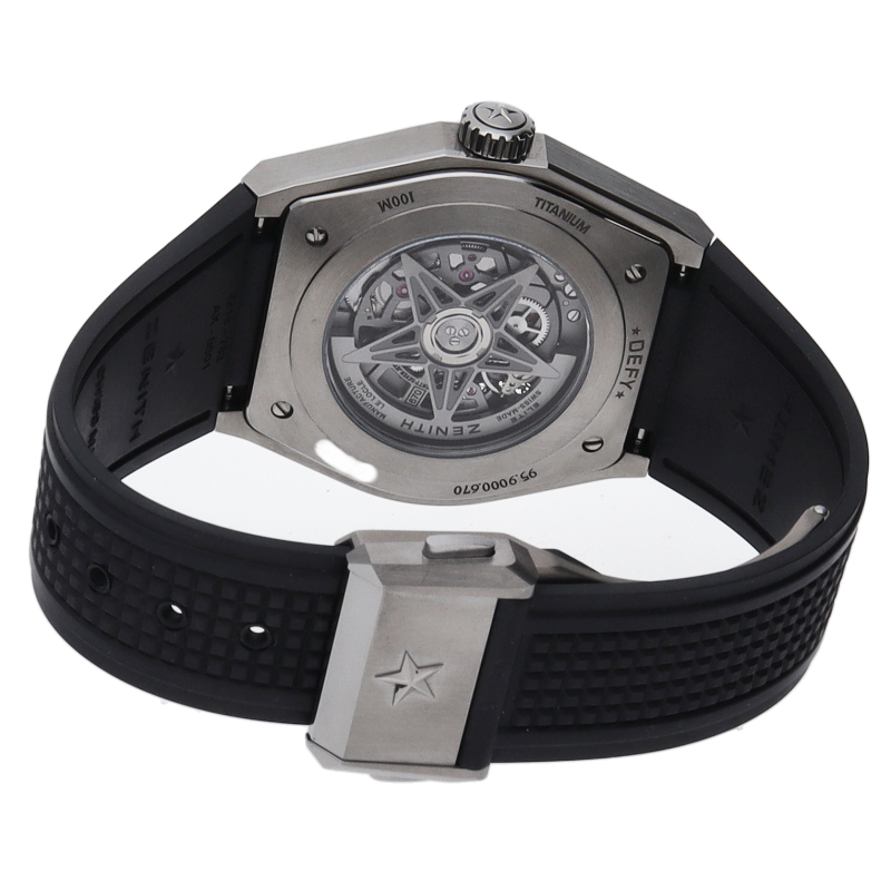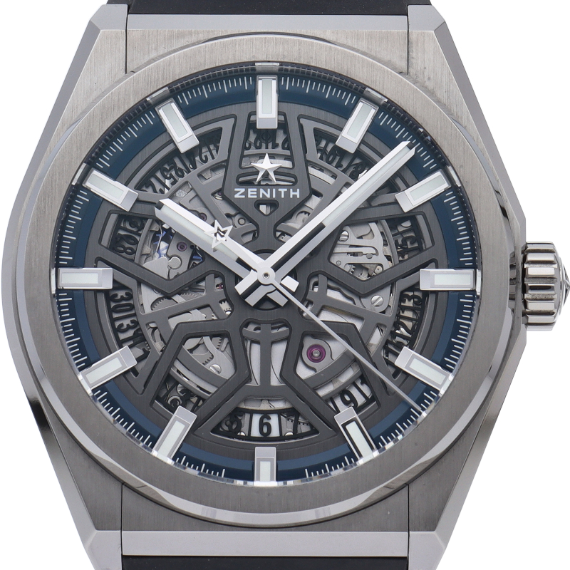 本質的な機能をまとめたスタイルは、デファイの美学を凝縮させています。大きなバトン型の時針と分針、有名な星のカウンターウェイトを備えた秒針が、ゼニスのシンボルである星を感じさせる5本のブランチの上を滑らかに回ります。ディープブルーのミニッツリングにはアプライドアワーマーカーが並び、スポーティなオープンワークのメカニズムを引き立てます。