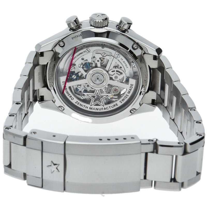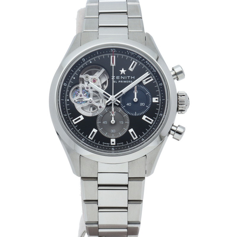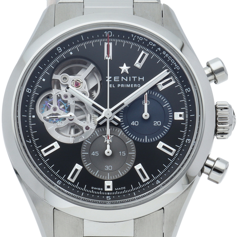 クロノマスター オープンは、エル・プリメロ ムーブメントの鼓動する心臓部を文字盤から眺めることができます。洗練された39.5mmのスチール製ケースに収められたこのモデルは、33色のカウンターのうち、9時位置のスモールセコンドカウンターは透明カウンターを備え、マットブラックの文字盤、一体型のスチール製ブレスレットが特徴です。