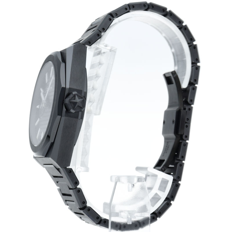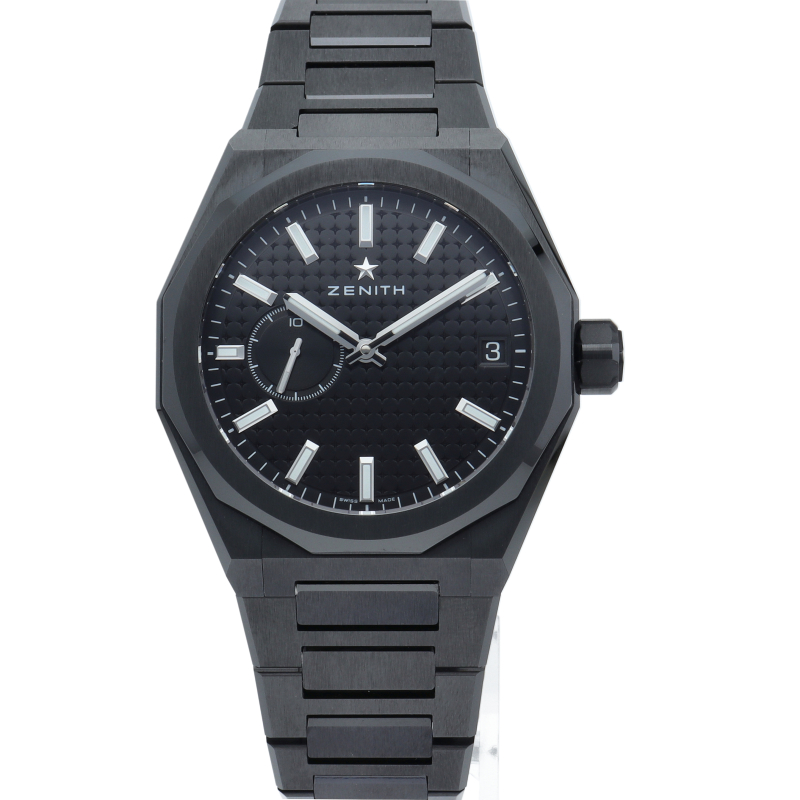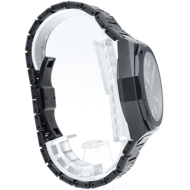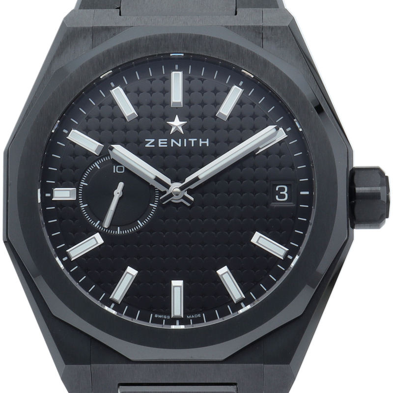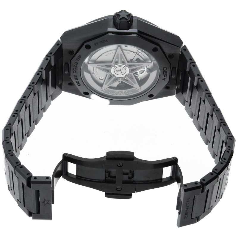デファイ スカイライン セラミックは、ファセットカットのベゼルを配した41mmブラックセラミック製の八角形のケースを使用し、ブラックのサンバースト仕上げを施した文字盤にはゼニスの象徴である4つの点を結んだ星を復刻してあしらっています。1/10秒精度を誇る初のインジケーターを備えた高振動エル プリメロ 3620自動巻クロノグラフムーブメントを搭載。