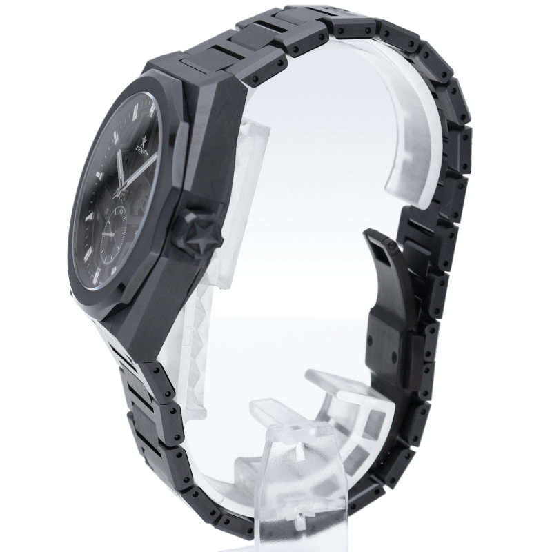 デファイ スカイライン セラミックは、ファセットカットのベゼルを配した41mmブラックセラミック製の八角形のケースを使用し、ブラックのサンバースト仕上げを施した文字盤にはゼニスの象徴である4つの点を結んだ星を復刻してあしらっています。1/10秒精度を誇る初のインジケーターを備えた高振動エル プリメロ 3620自動巻クロノグラフムーブメントを搭載。