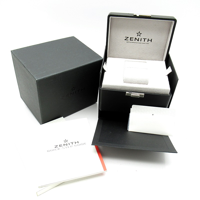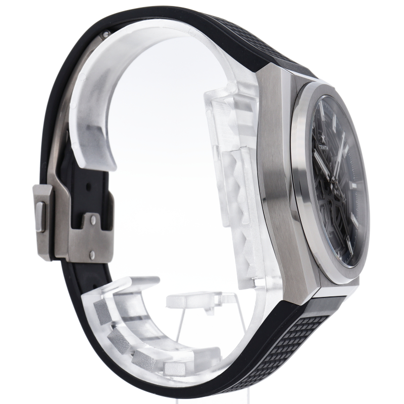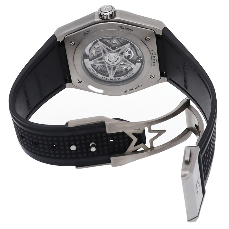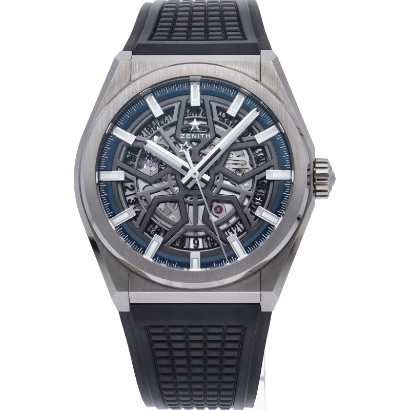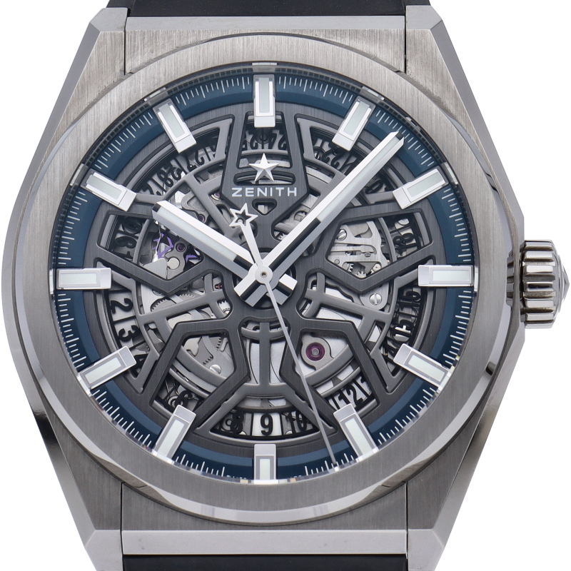 本質的な機能をまとめたスタイルは、デファイの美学を凝縮させています。大きなバトン型の時針と分針、有名な星のカウンターウェイトを備えた秒針が、ゼニスのシンボルである星を感じさせる5本のブランチの上を滑らかに回ります。ディープブルーのミニッツリングにはアプライドアワーマーカーが並び、スポーティなオープンワークのメカニズムを引き立てます。