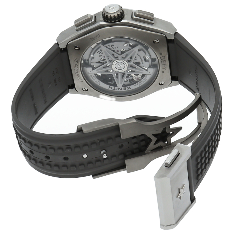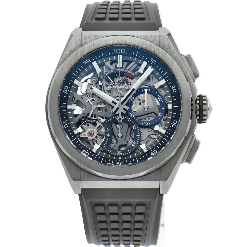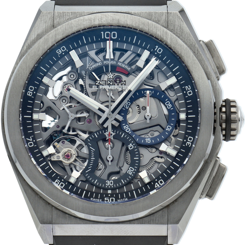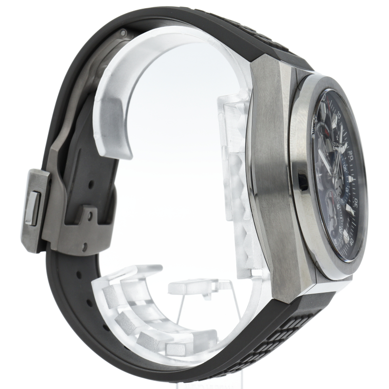 高振動エル・プリメロ 21の1/100秒計測のクロノグラフは、44mmチタン製デファイケースに、チタン製ブレスレットを備えています。その自動巻ムーブメントは、クロノグラフ機能用に50Hz、計時用に5Hzで動作する2つの独立した高振動脱進機を備えています。