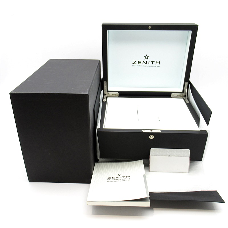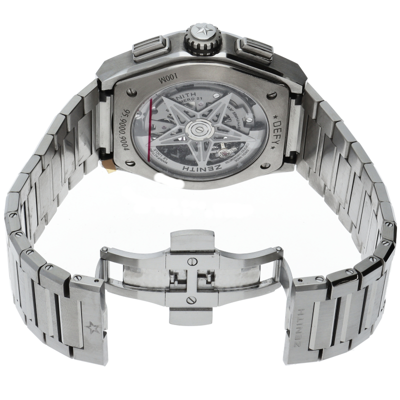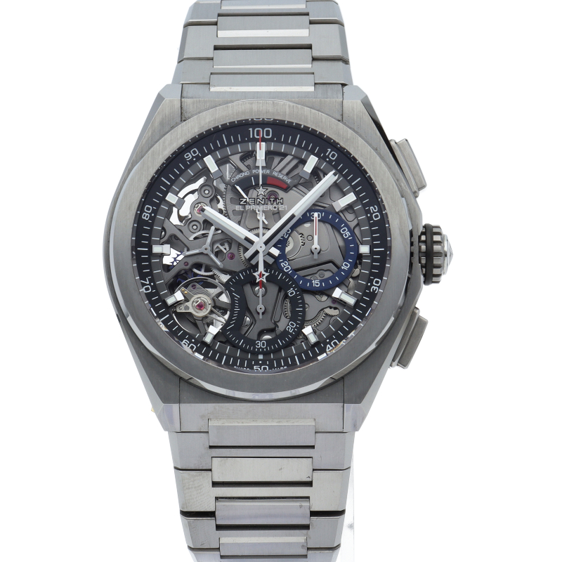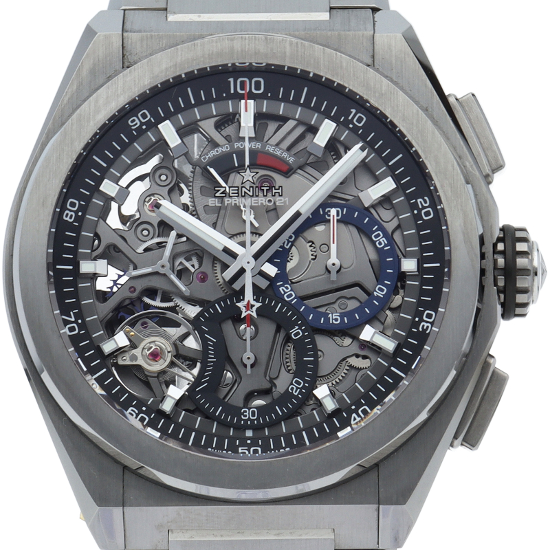 高振動エル・プリメロ 21の1/100秒計測のクロノグラフは、44mmチタン製デファイケースに、チタン製ブレスレットを備えています。その自動巻ムーブメントは、クロノグラフ機能用に50Hz、計時用に5Hzで動作する2つの独立した高振動脱進機を備えています。