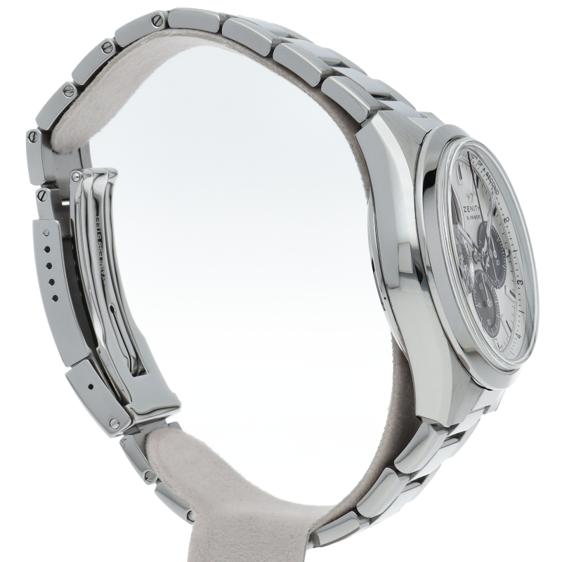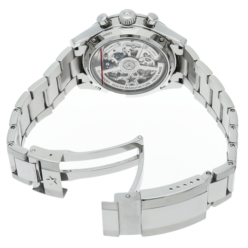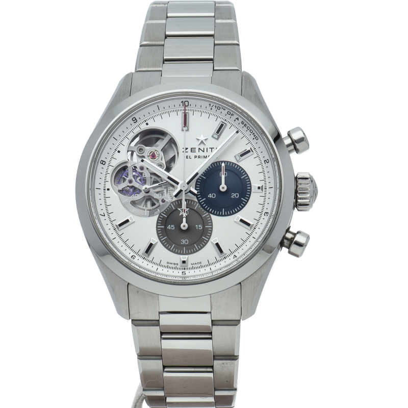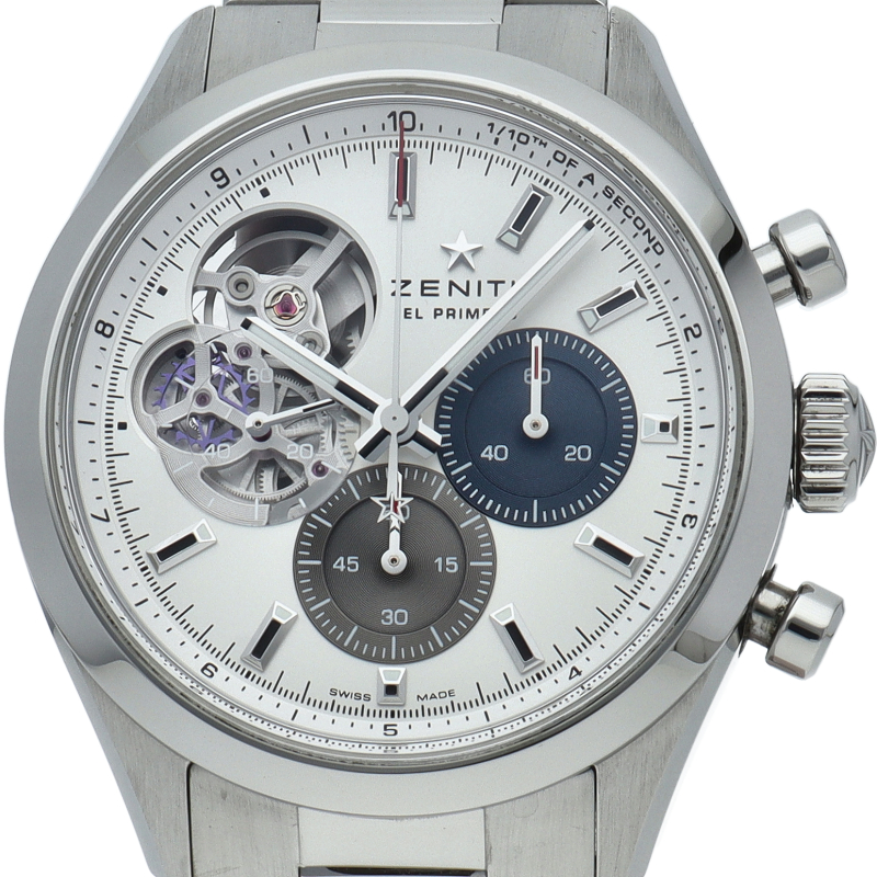 クロノマスター オープンは、エル・プリメロ ムーブメントの鼓動する心臓部を文字盤から眺めることができます。洗練された40mmのスチール製ケースに収められたこのモデルは、3色のカウンターとスモールセコンド用の透明カウンターを備えたマットシルバーの文字盤、一体型のスチール製ブレスレットが付属しています。