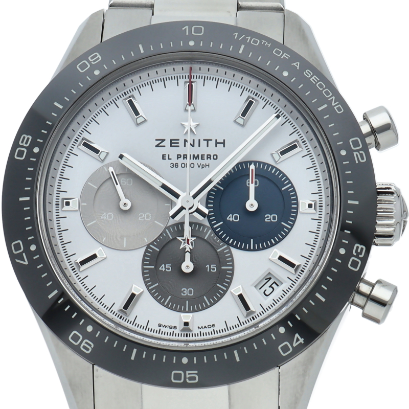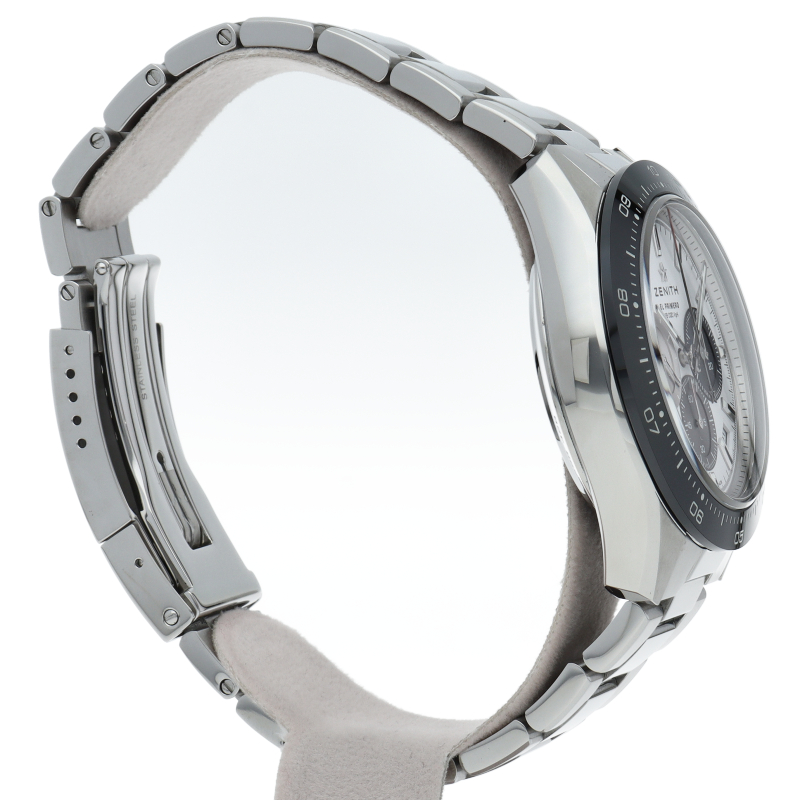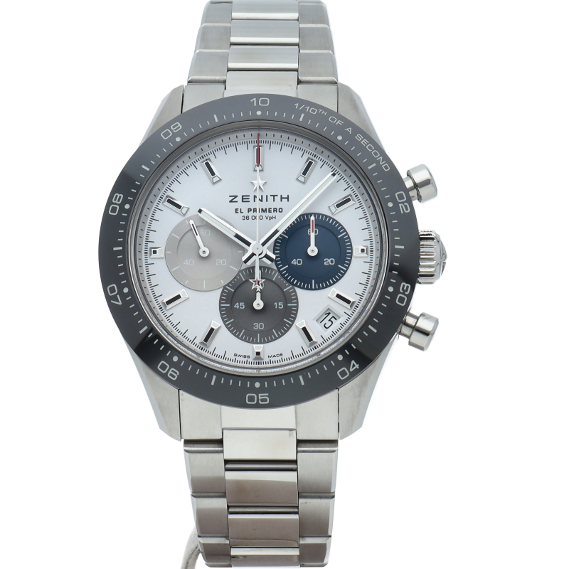 クロノマスター スポーツは、ゼニスが50年以上に渡って探求してきたスポーティーなクロノグラフと自動巻クロノグラフ キャリバーの頂点に立つモデルです。1/10秒単位の精度で経過時間を計測および表示する最新のエル・プリメロ クロノグラフ キャリバーを搭載したこのモデルは、現代的でありながら見間違えることのないゼニスらしいデザインを備えています。