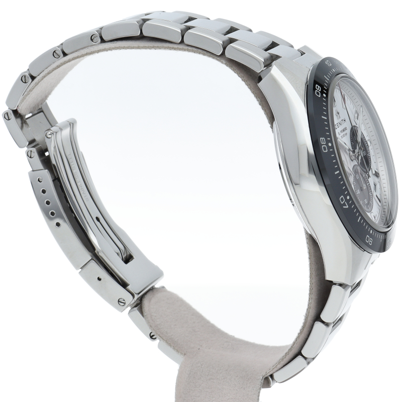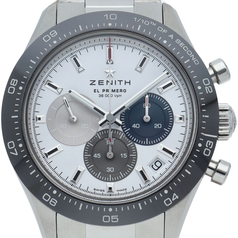 クロノマスター スポーツは、ゼニスが50年以上に渡って探求してきたスポーティーなクロノグラフと自動巻クロノグラフ キャリバーの頂点に立つモデルです。1/10秒単位の精度で経過時間を計測および表示する最新のエル・プリメロ クロノグラフ キャリバーを搭載したこのモデルは、現代的でありながら見間違えることのないゼニスらしいデザインを備えています。
