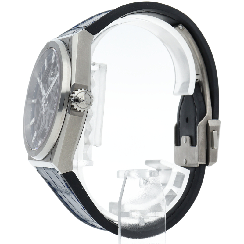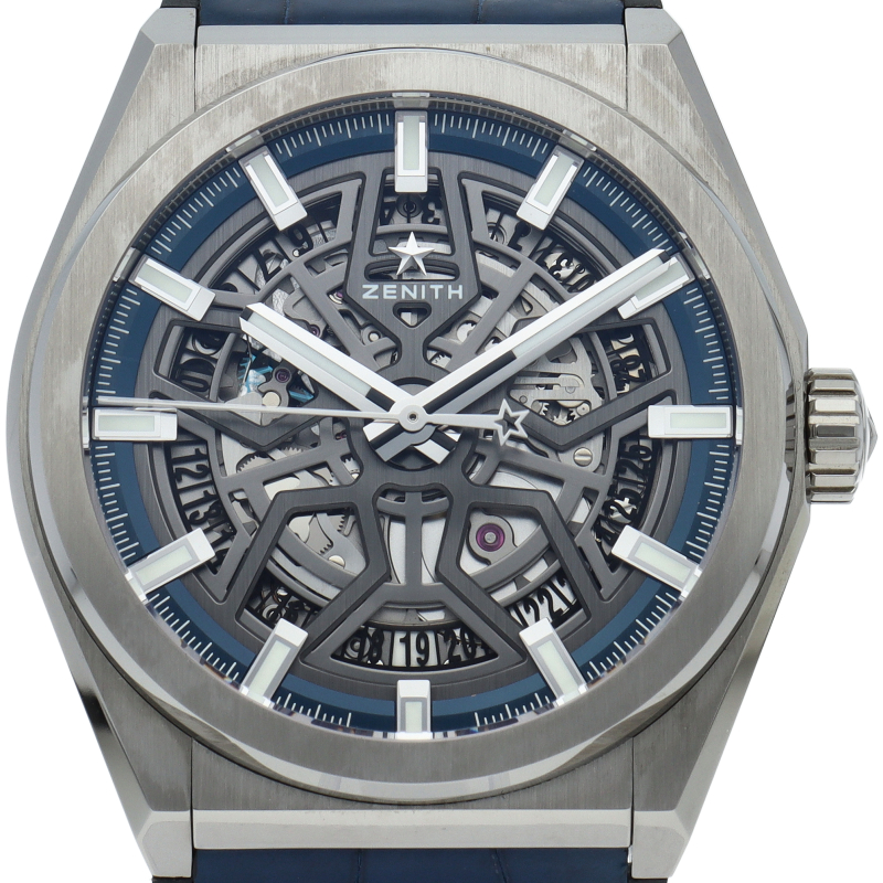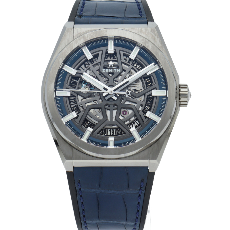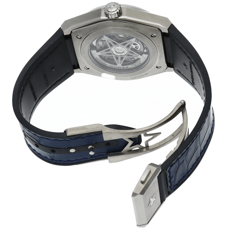 本質的な機能をまとめたスタイルは、デファイの美学を凝縮させています。大きなバトン型の時針と分針、有名な星のカウンターウェイトを備えた秒針が、ゼニスのシンボルである星を感じさせる5本のブランチの上を滑らかに回ります。ディープブルーのミニッツリングにはアプライドアワーマーカーが並び、スポーティなオープンワークのメカニズムを引き立てます。