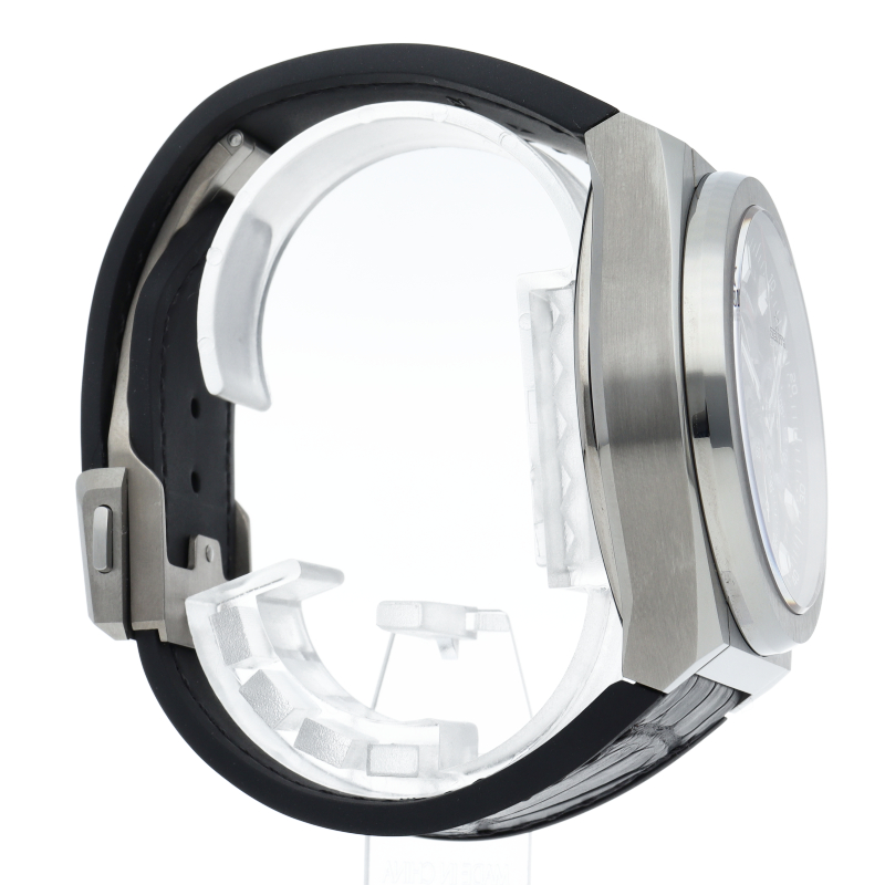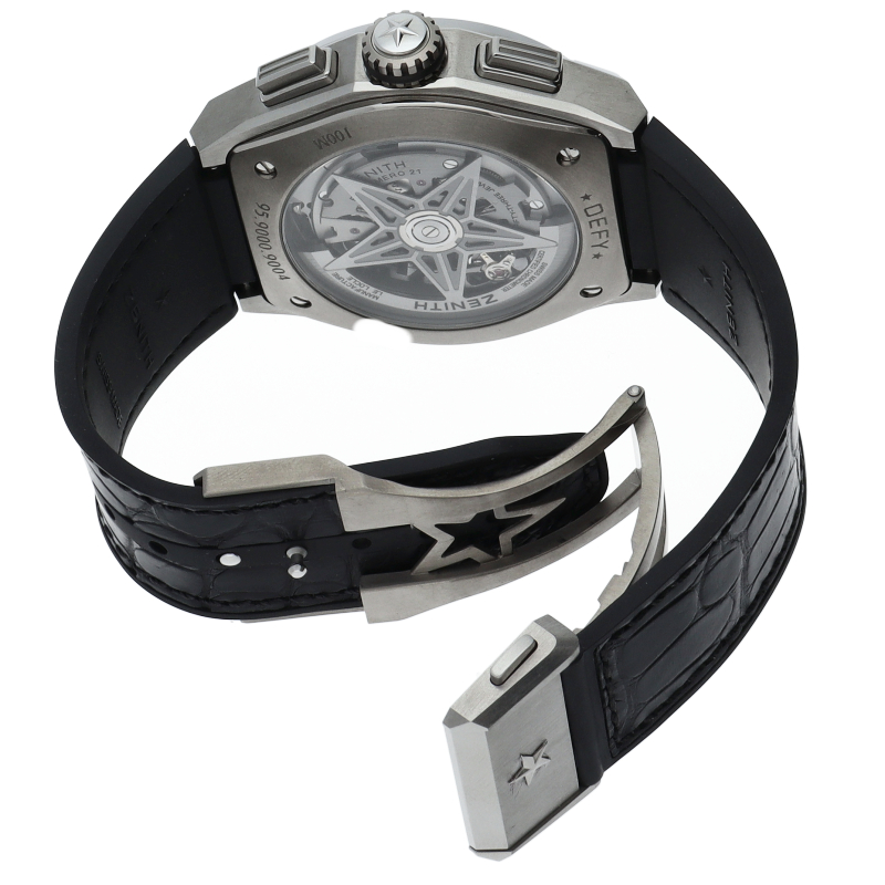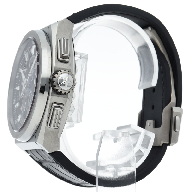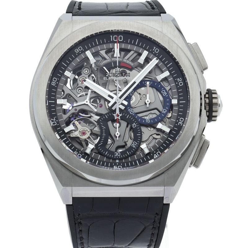 高振動エル・プリメロ 21の1/100秒計測のクロノグラフは、44mmチタン製デファイケースに、チタン製ブレスレットを備えています。その自動巻ムーブメントは、クロノグラフ機能用に50Hz、計時用に5Hzで動作する2つの独立した高振動脱進機を備えています。