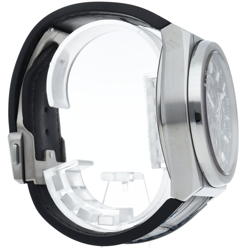 エルプリメロ9004を搭載した「デファイ エルプリメロ21”。1秒で1回転するセンターのクロノ針は、ダイアル外周に1/100秒を計測可能なスケールを備えています。最大の特徴はゼンマイの巻上げ方法で、リューズを反時計回りに回すことで通常のゼンマイの巻上げを行います。また、リューズを時計回りに回すとクロノグラフのゼンマイを巻き上げを行い、残量を12時位置のインジケーターで表示します。