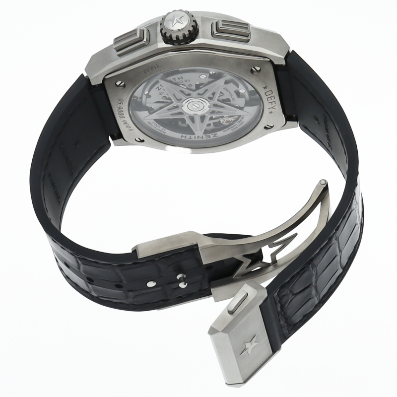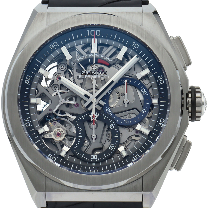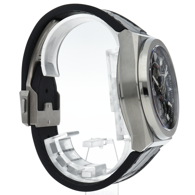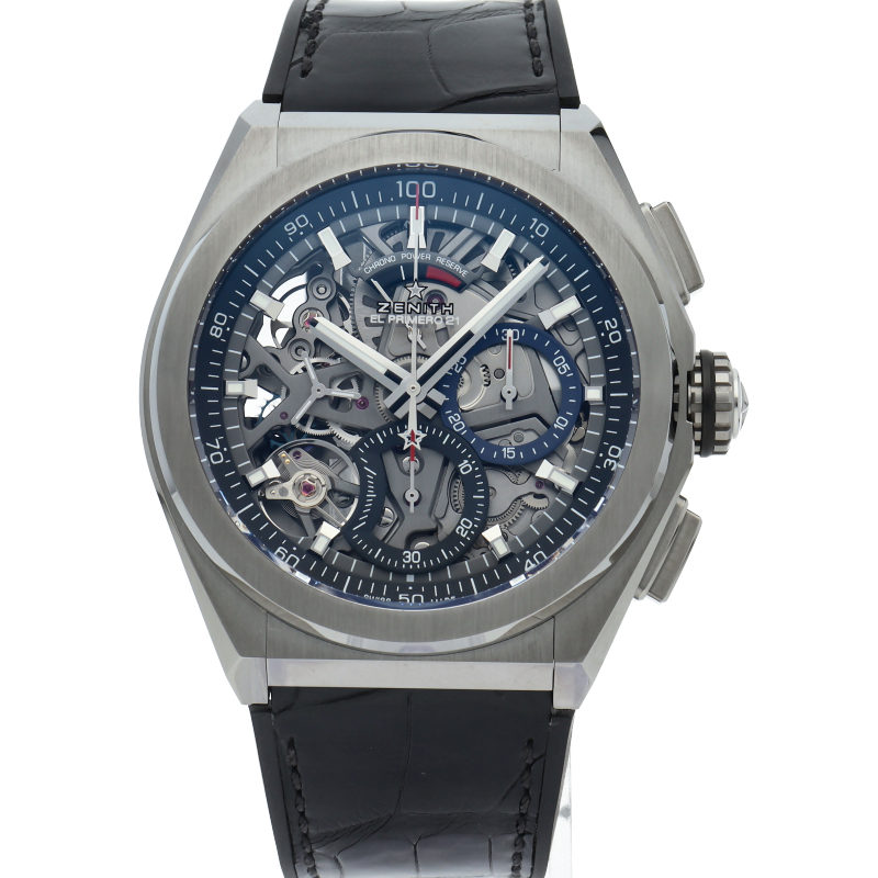 高振動エル・プリメロ 21の1/100秒計測のクロノグラフは、44mmチタン製デファイケースに、チタン製ブレスレットを備えています。その自動巻ムーブメントは、クロノグラフ機能用に50Hz、計時用に5Hzで動作する2つの独立した高振動脱進機を備えています。
