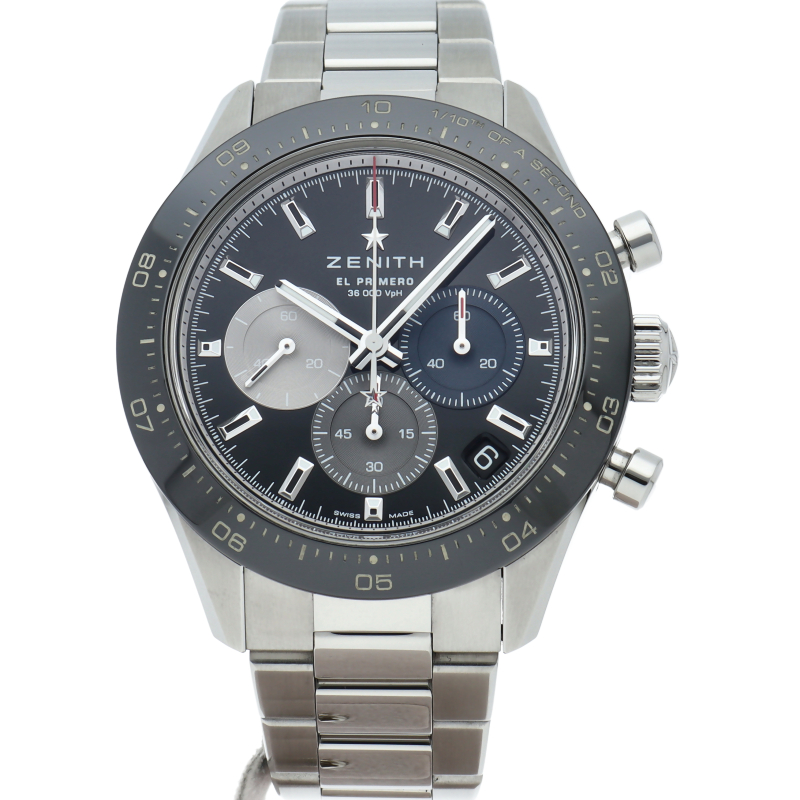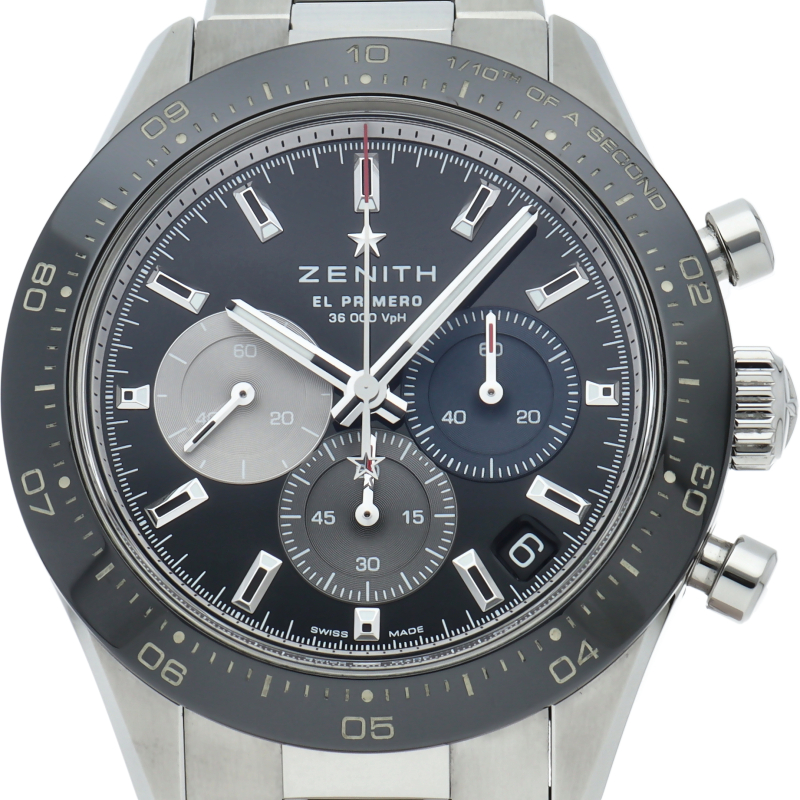 クロノマスター スポーツは、3色文字盤、ポンプ型のプッシュボタン、スチール製ブレスレットとセラミック製のブラックベゼルなど、過去のゼニス クロノグラフの要素を現代的な41mmケースに組み込んでいます。このバージョンには、ブラックの文字盤と一体型のスチール製ブレスレットが付属しています。