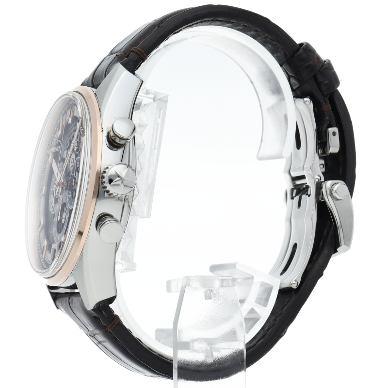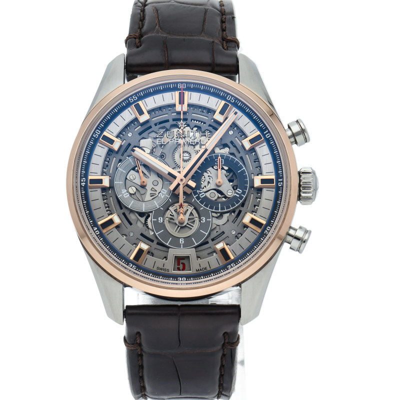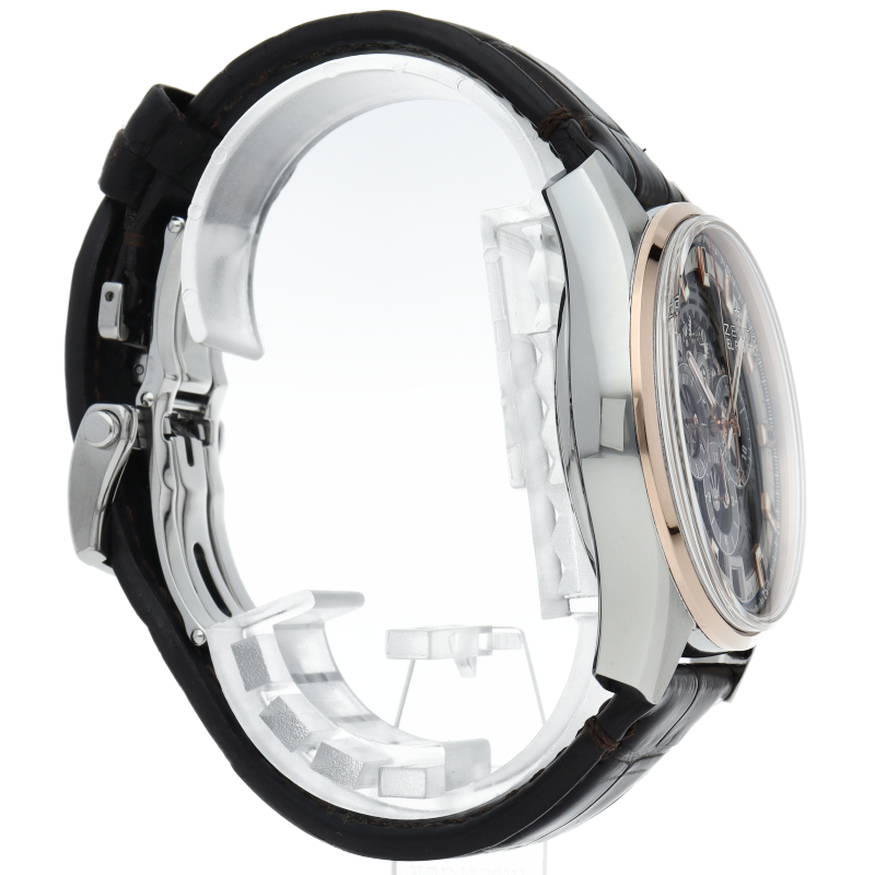 バーゼルワールド2017で発表された「クロノマスター エルプリメロ フルオープン42mm」。1969年発表の初代エルプリメロを、現代の技術をフル活用してムーブメントの観賞のしやすさに特化したモデルを実現。こちらはステンレスケースとローズゴールドベゼルのコンビモデルです。インダイアルの枠にはオリジナルモデルの3色カウンターを使用していますが、その他の部分はスケルトン仕様となっております。