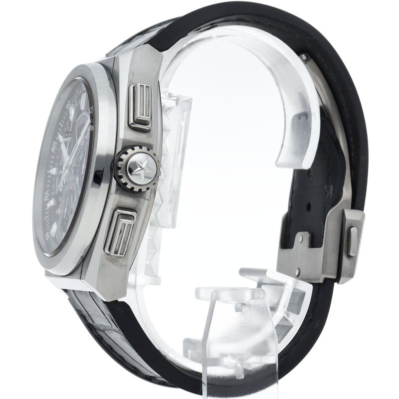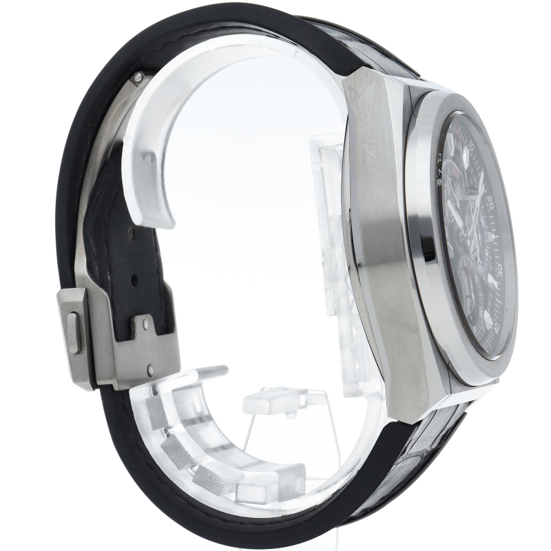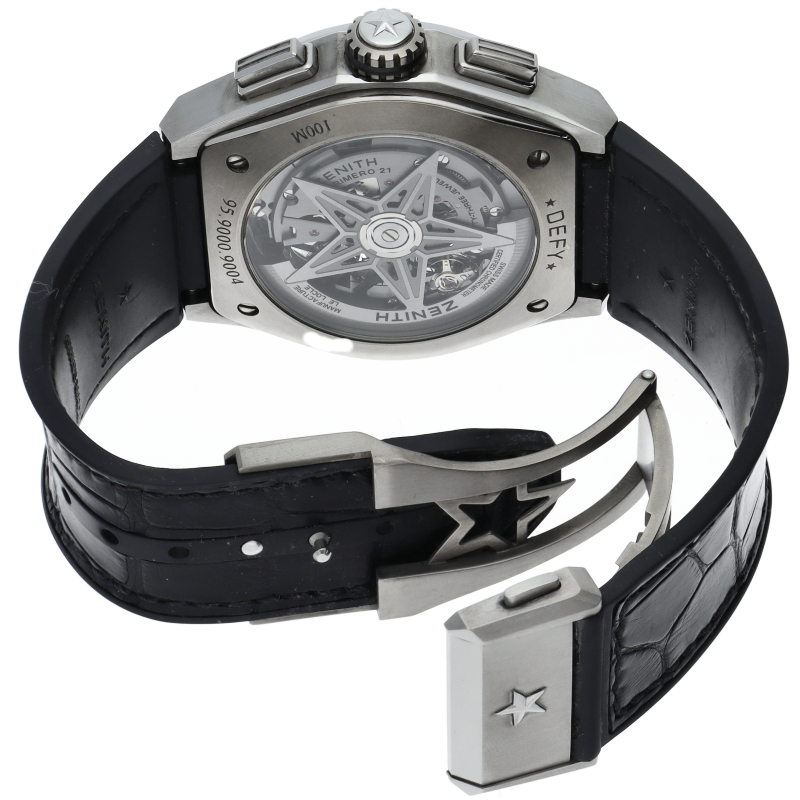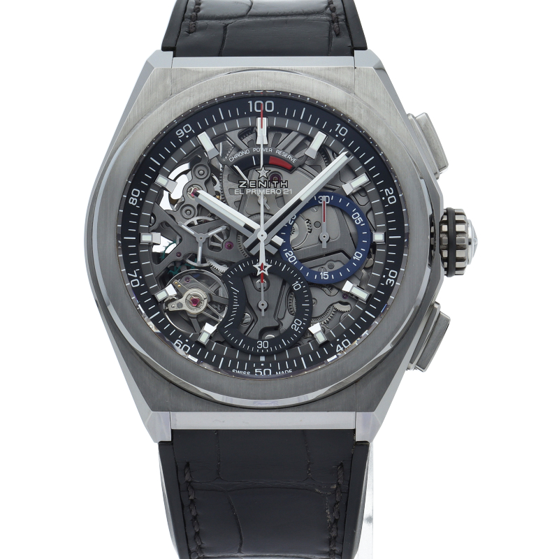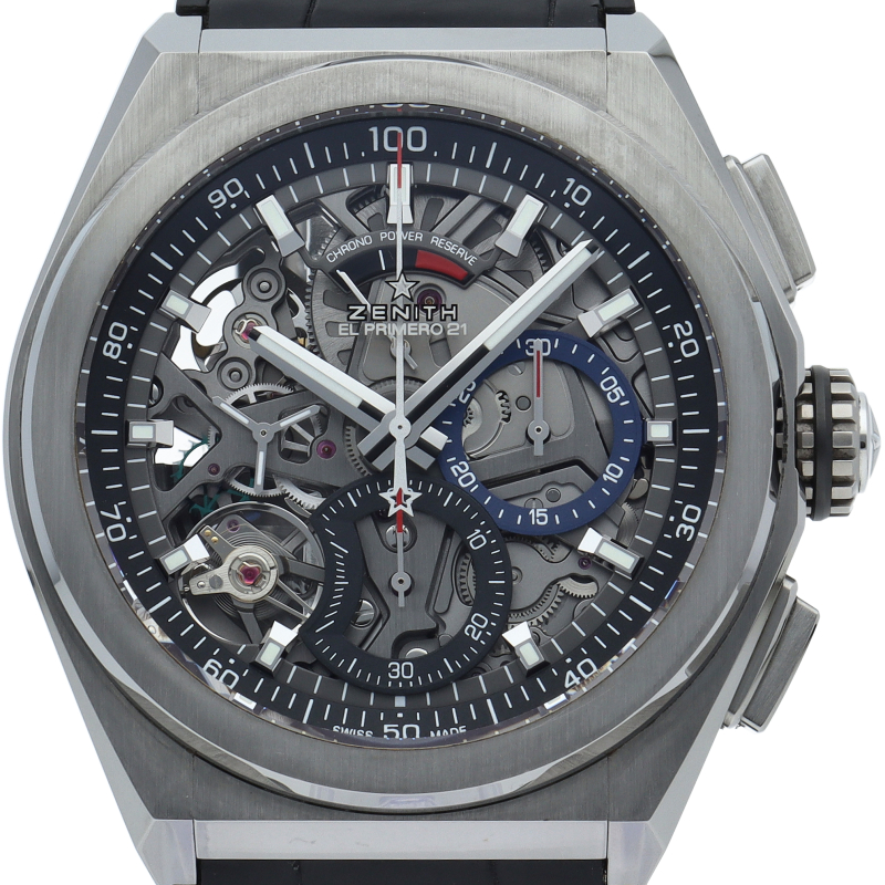 高振動エル・プリメロ 21の1/100秒計測のクロノグラフは、44mmチタン製デファイケースに、チタン製ブレスレットを備えています。その自動巻ムーブメントは、クロノグラフ機能用に50Hz、計時用に5Hzで動作する2つの独立した高振動脱進機を備えています。