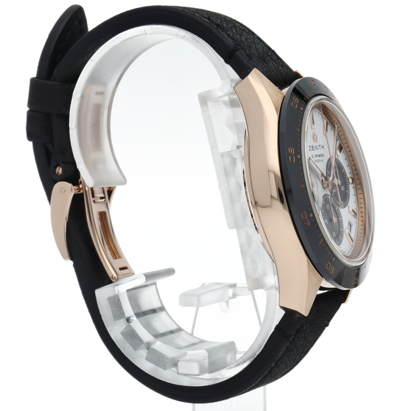 もはや説明は要らない程の絶大な人気と知名度を持つ、名機エルプリメロを搭載した「クロノマスター」。こちらはゼニスが50年以上もの歳月を掛けて追求してきたスポーツクロノグラフの頂点となるピンクゴールドケースモデルです。シースルーバックから覗くムーブメントにはゼニスが誇る10振動ムーブメントのエル・プリメロを搭載し、1/10秒単位の高精度な計測を可能としています。