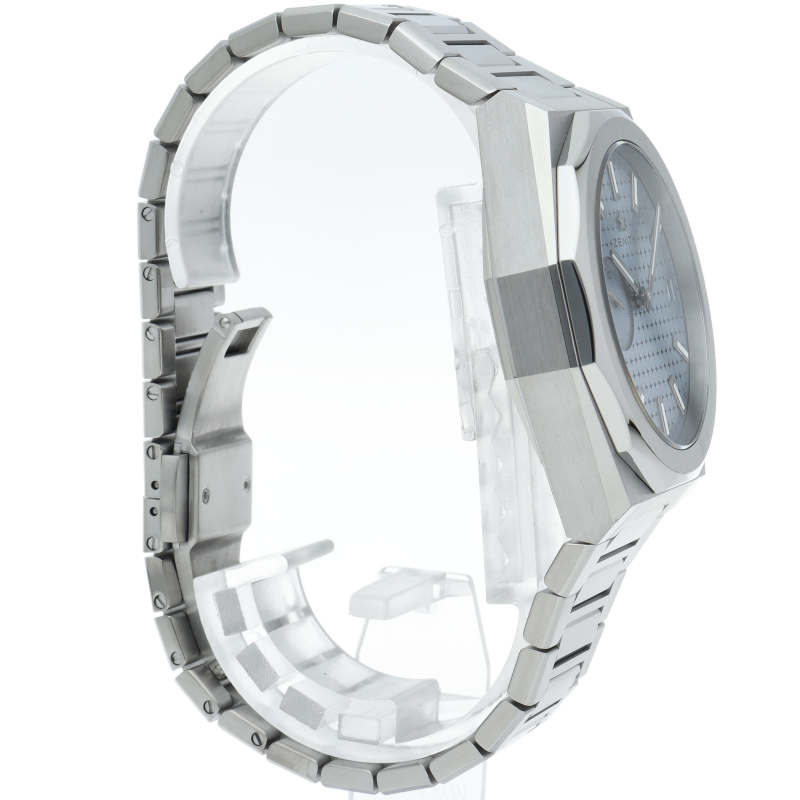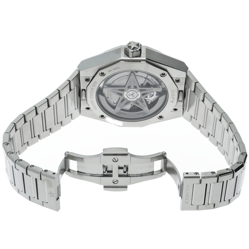 「デファイ スカイライン」は、単に過去のモデルを再現しようとしたのではなく、初期のデファイ モデルのユニークな八角形のフォルムからインスピレーションを得ています。1/10秒精度を誇る初のインジケーターを備えた高振動の自動巻きクロノグラフムーブメントキャリバー(エルプリメロ3620)を搭載。クイックストラップチェンジ機構によりステンレススチール製ブレスレットと付属のストラップを簡単に交換することができます。