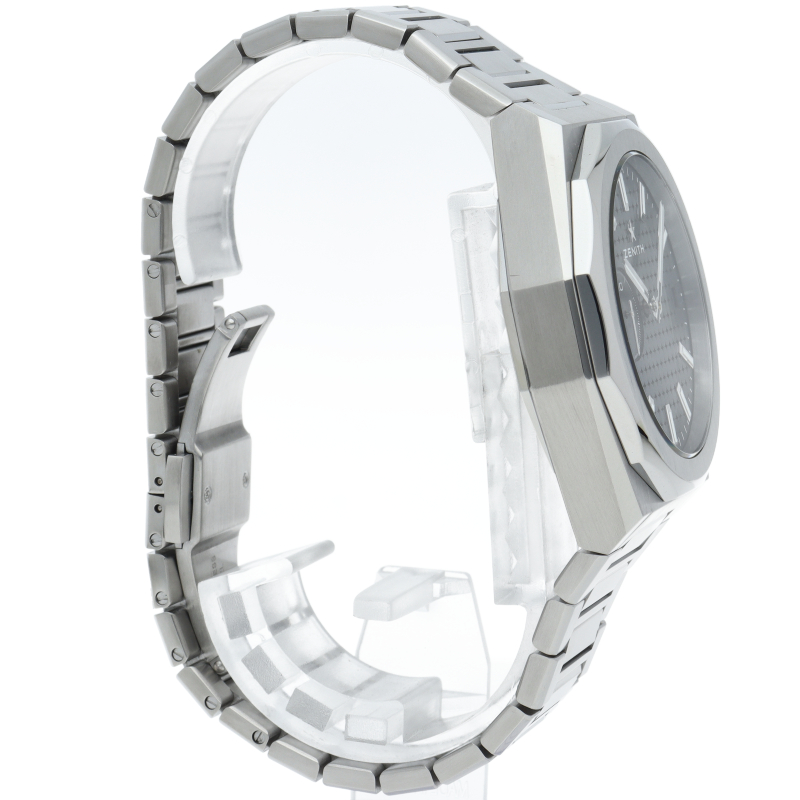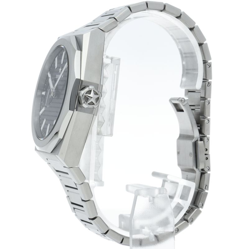 「デファイ スカイライン」は、単に過去のモデルを再現しようとしたのではなく、初期のデファイ モデルのユニークな八角形のフォルムからインスピレーションを得ています。ファセットカットのベゼルを配したステンレススチール製の八角形のケースを使用し、ブラックトーンのサンバースト仕上げを施した文字盤にはゼニスの象徴である4つの点を結んだ星を復刻させてあしらっています。