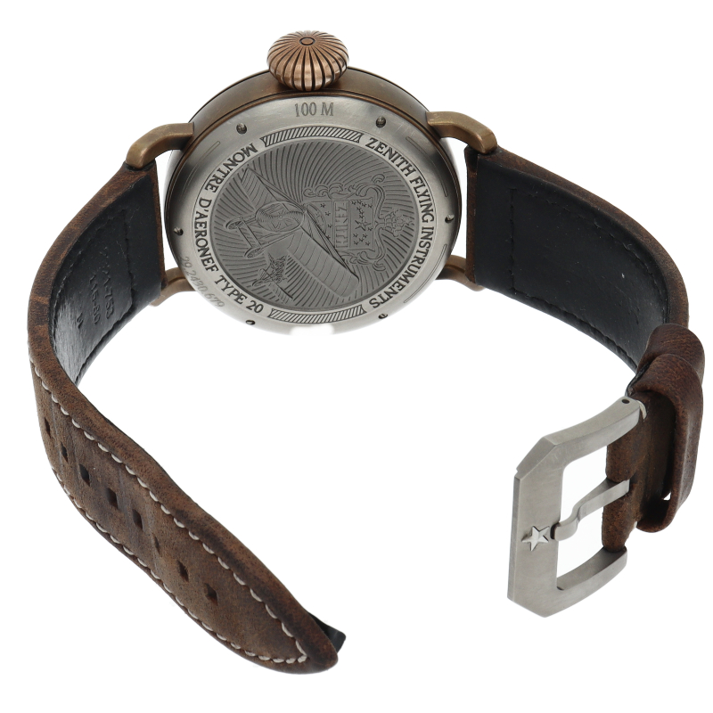 ゼニスの伝説的なパイロットウォッチからインスピレーションした「パイロット タイプ20」。こちらは仏航空界を牽引したパイロット”ルイ・ブレリオ”が使用していた 初期型のパイロットウォッチを現代に蘇らせたモデルです。ブラックマットダイヤルにグリーンオイリーヌバックレザーストラップとも相まって、ヴィンテージ感溢れる一本です。