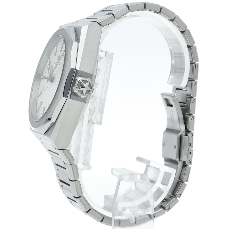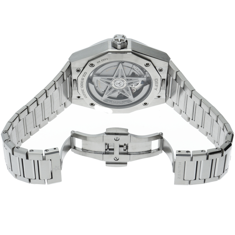 「デファイ スカイライン」は、単に過去のモデルを再現しようとしたのではなく、初期のデファイ モデルのユニークな八角形のフォルムからインスピレーションを得ています。ファセットカットのベゼルを配したステンレススチール製の八角形のケースを使用し、ブラックトーンのサンバースト仕上げを施した文字盤にはゼニスの象徴である4つの点を結んだ星を復刻させてあしらっています。