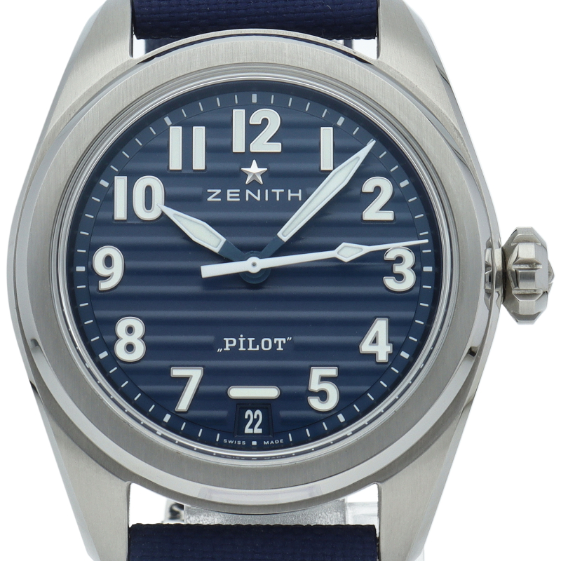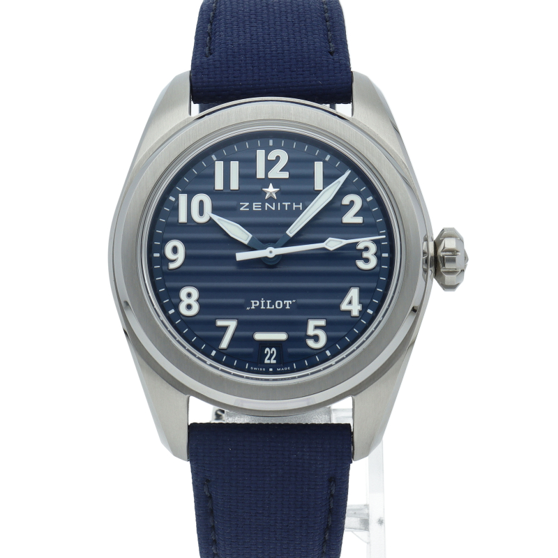 ゼニス パイロットウォッチの新世代モデルである「パイロット オートマティック」。新しいケースデザインを採用し、ラウンド型にフラットトップ ラウンド型ベゼルが採用されています。6時位置にデイトも備え日常使いにも適しており、60時間パワーリザーブを誇るキャリバー3620を搭載しております。