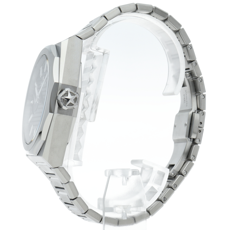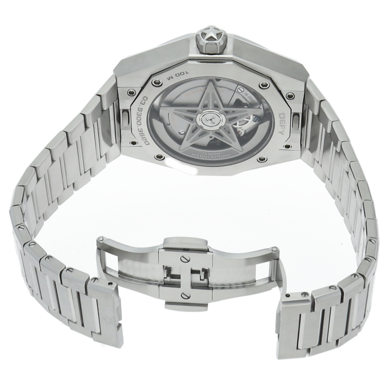 「デファイ スカイライン」は、単に過去のモデルを再現しようとしたのではなく、初期のデファイ モデルのユニークな八角形のフォルムからインスピレーションを得ています。ファセットカットのベゼルを配したステンレススチール製の八角形のケースを使用し、ブラックトーンのサンバースト仕上げを施した文字盤にはゼニスの象徴である4つの点を結んだ星を復刻させてあしらっています。