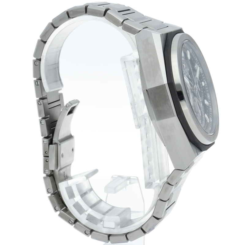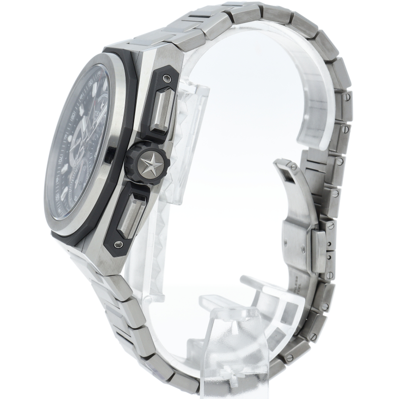 ゼニスが誇る10振動クロノグラフムーブメントのエル・プリメロを搭載した「デファイ エクストリーム」。エルプリメロの持つ36000振動を最大限に活かした1/100秒クロノグラフモデルとなり、センターに設けられたクロノ秒針は1秒で1回転します。3時位置には30分積算計、6時位置には60秒カウンター、そして9時位置はスモールセコンドの配置となります。
