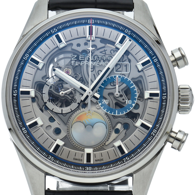 1969年発表の初代エル・プリメロをイメージした色使いに、現代のゼニスのシンボルであるダイヤルをくりぬいた「窓」を融合させた「エルプリメロ クロノマスター オープン」。シースルーバッグからムーブメントもご覧いただけます。グランデイト機能、ムーンフェイズ&サンフェイズ表示、そしてクロノグラフ機能を備えたエル・プリメロ4047Bを搭載。