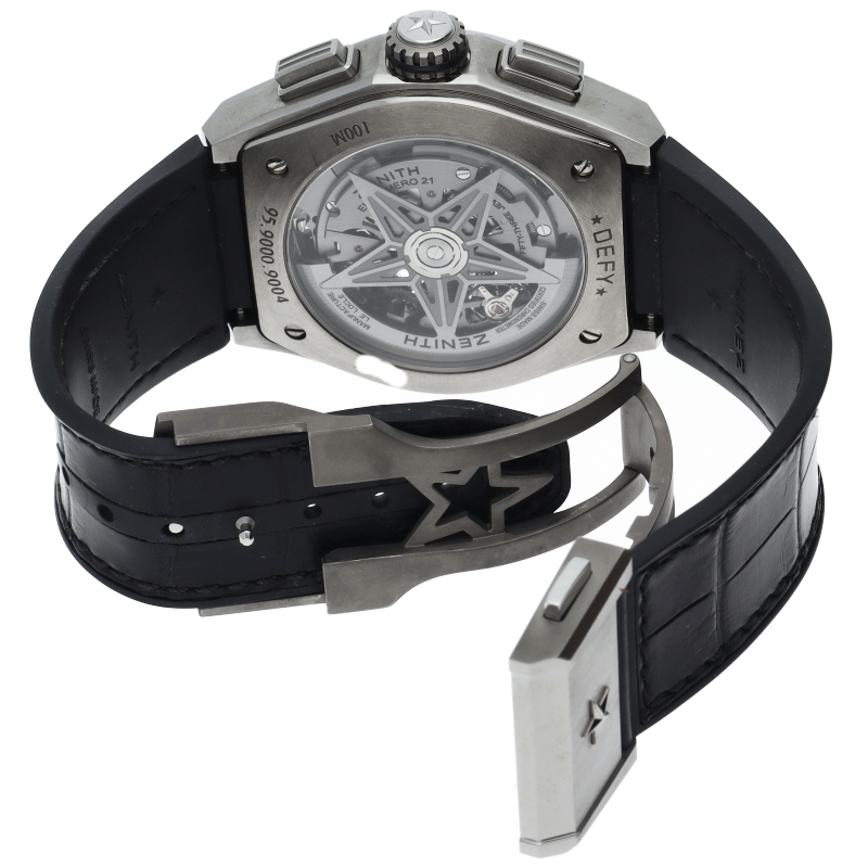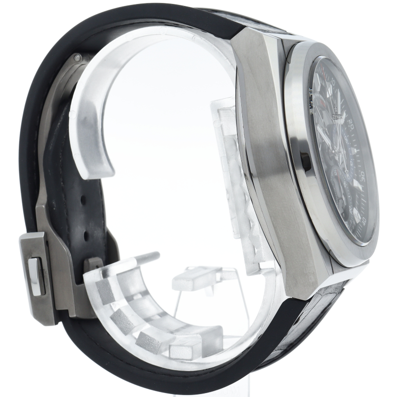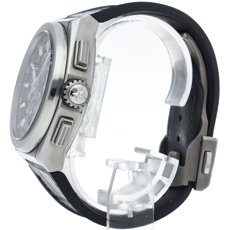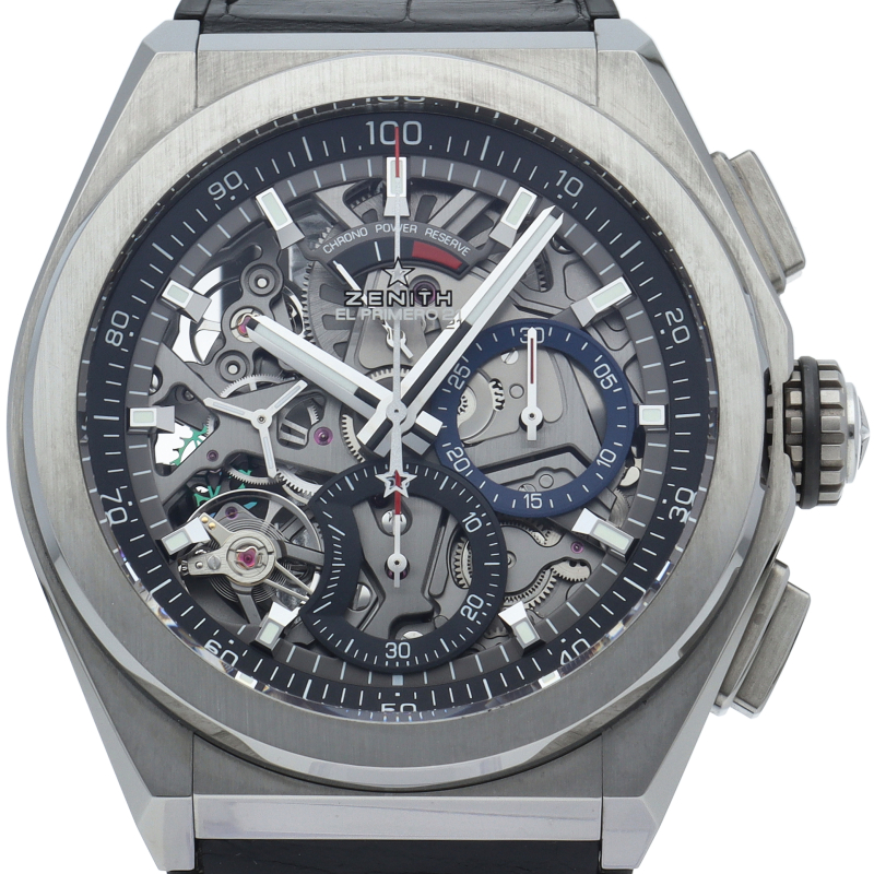 高振動エル・プリメロ 21の1/100秒計測のクロノグラフは、44mmチタン製デファイケースに、チタン製ブレスレットを備えています。その自動巻ムーブメントは、クロノグラフ機能用に50Hz、計時用に5Hzで動作する2つの独立した高振動脱進機を備えています。