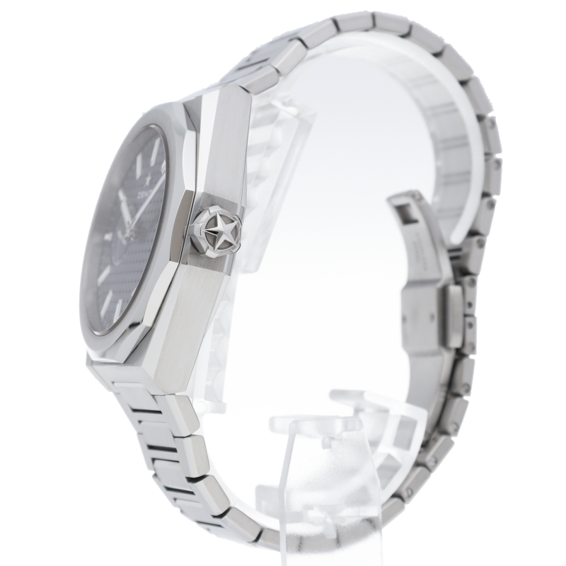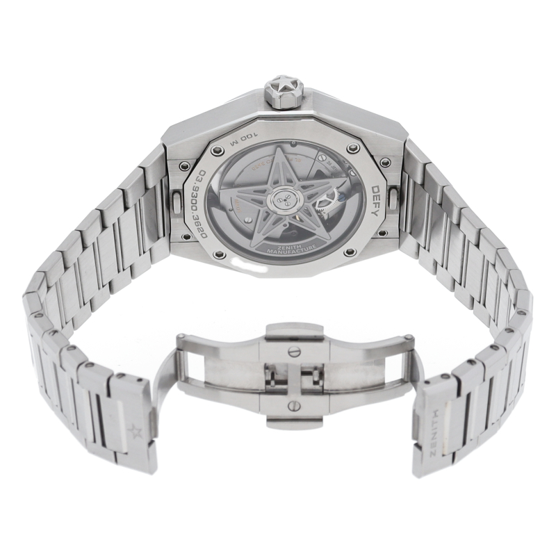 「デファイ スカイライン」は、単に過去のモデルを再現しようとしたのではなく、初期のデファイ モデルのユニークな八角形のフォルムからインスピレーションを得ています。ファセットカットのベゼルを配したステンレススチール製の八角形のケースを使用し、ブラックトーンのサンバースト仕上げを施した文字盤にはゼニスの象徴である4つの点を結んだ星を復刻させてあしらっています。