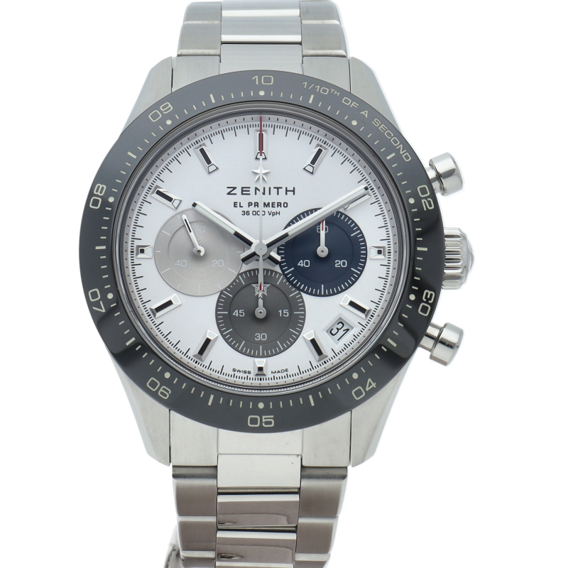 クロノマスター スポーツは、ゼニスが50年以上に渡って探求してきたスポーティーなクロノグラフと自動巻クロノグラフ キャリバーの頂点に立つモデルです。1/10秒単位の精度で経過時間を計測および表示する最新のエル・プリメロ クロノグラフ キャリバーを搭載したこのモデルは、現代的でありながら見間違えることのないゼニスらしいデザインを備えています。