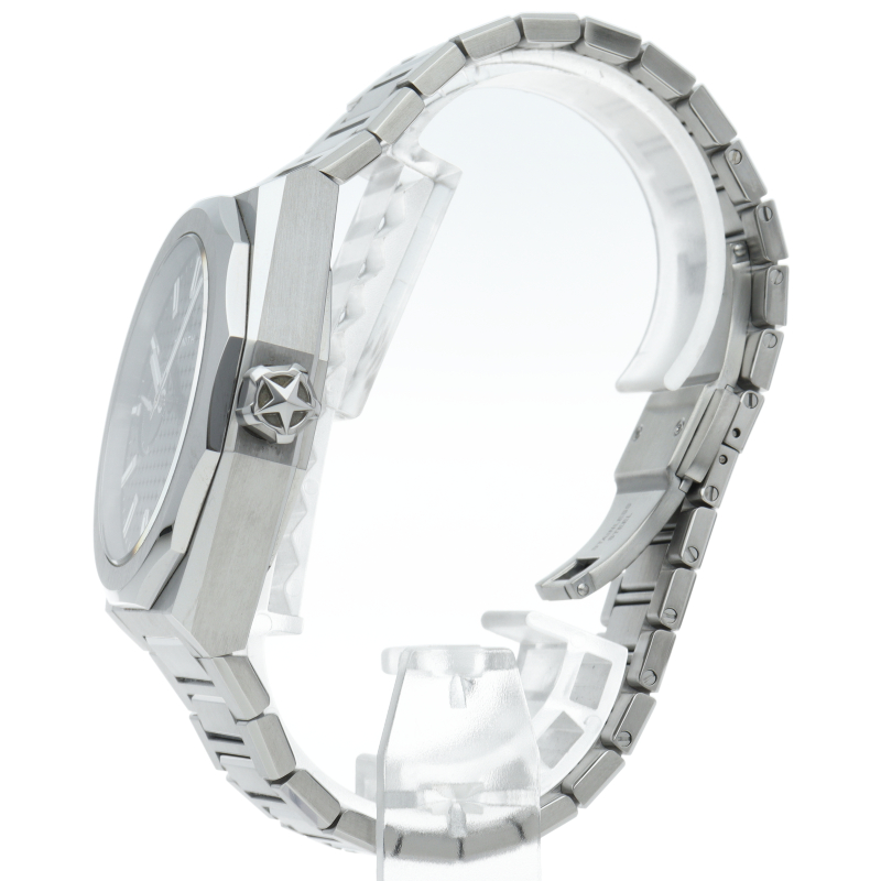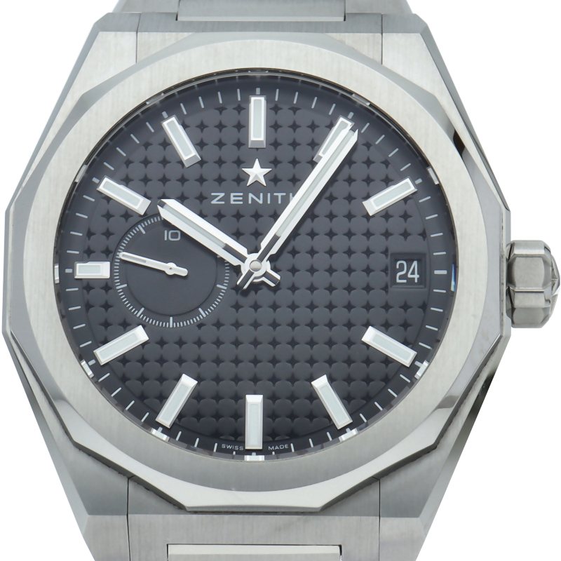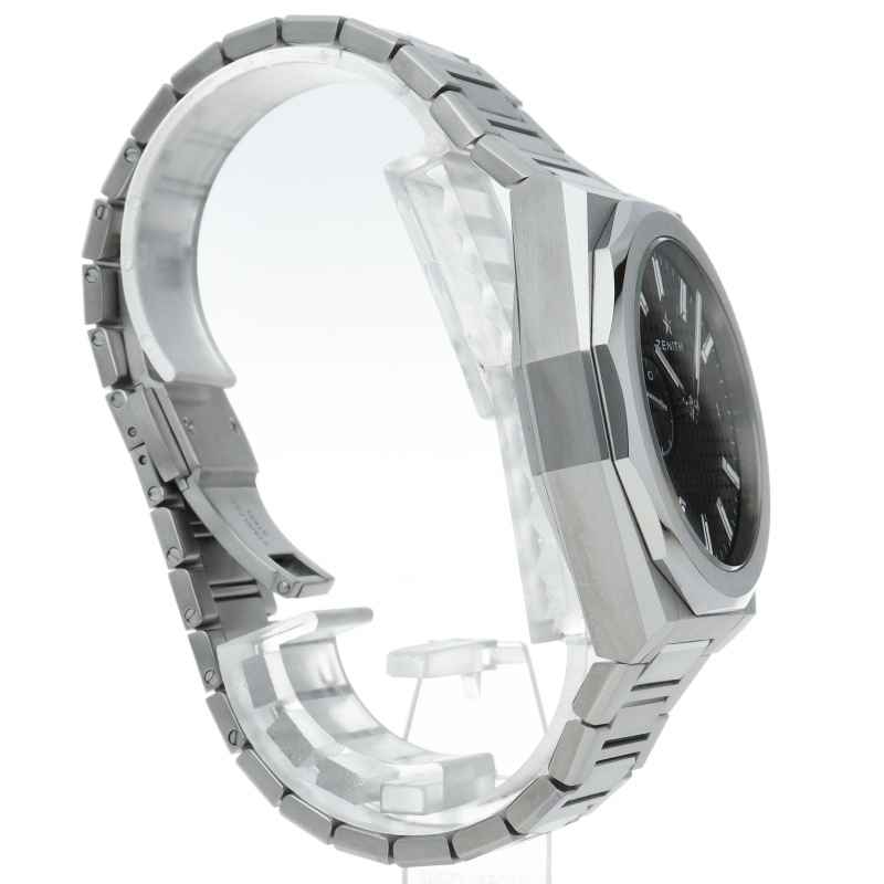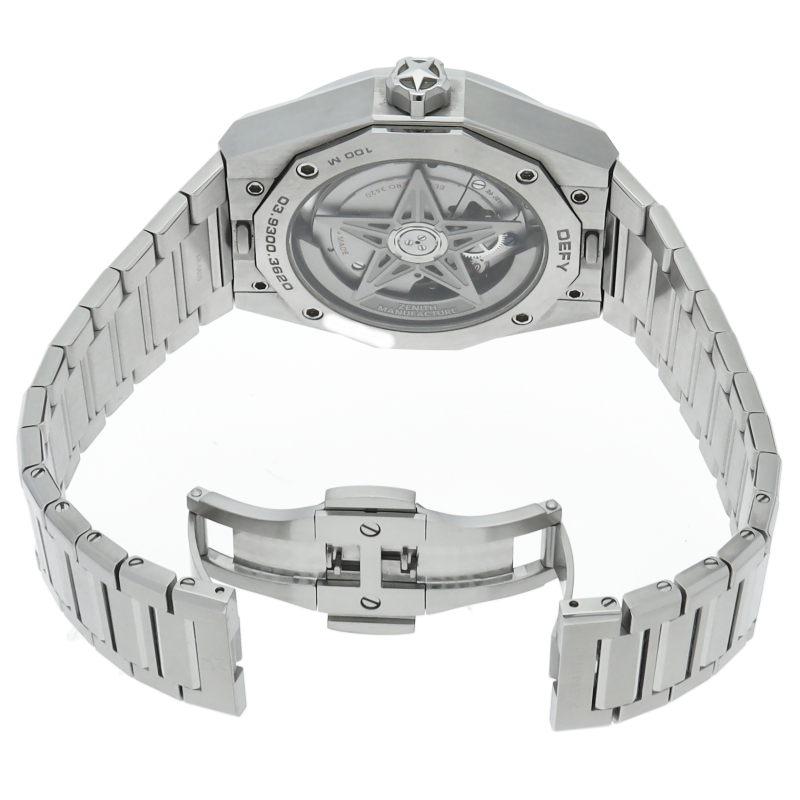 「デファイ スカイライン」は、単に過去のモデルを再現しようとしたのではなく、初期のデファイ モデルのユニークな八角形のフォルムからインスピレーションを得ています。ファセットカットのベゼルを配したステンレススチール製の八角形のケースを使用し、ブラックトーンのサンバースト仕上げを施した文字盤にはゼニスの象徴である4つの点を結んだ星を復刻させてあしらっています。